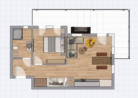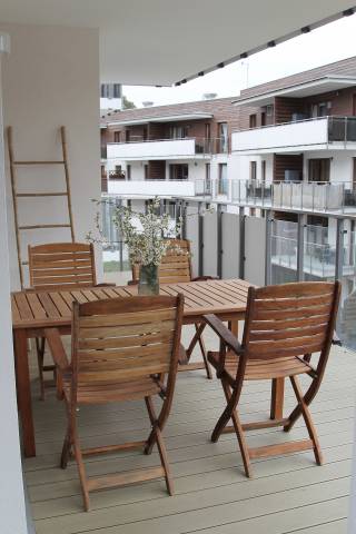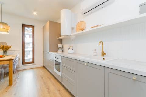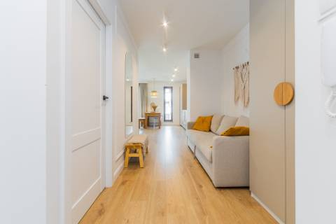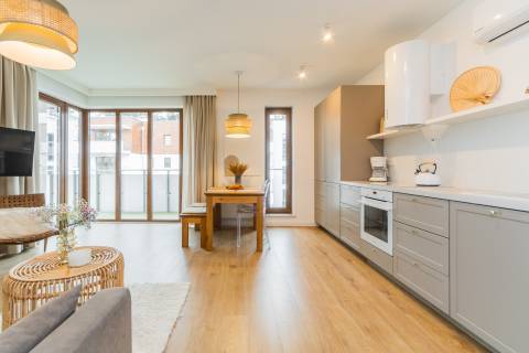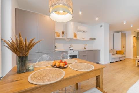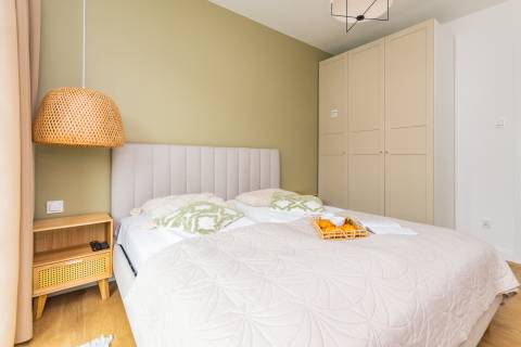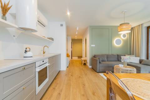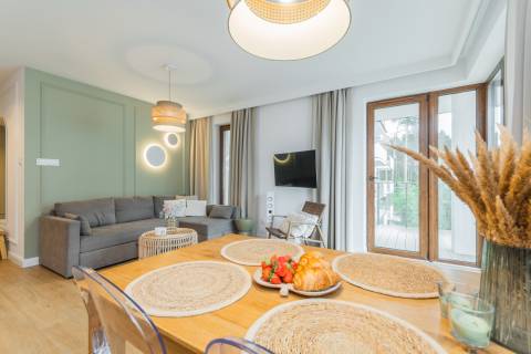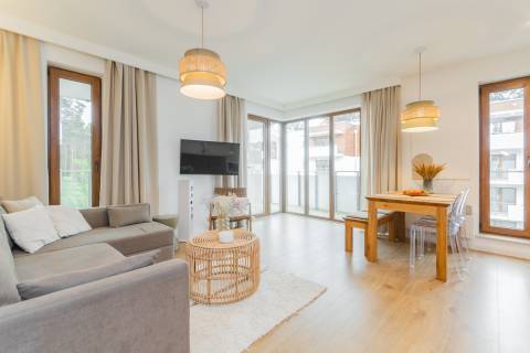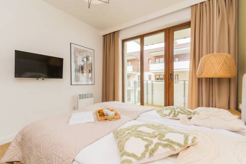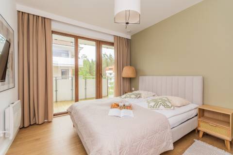 Lokal zlokalizowany na II piętrze pow. 50m2 w ekspozycji wschodnio-południowej. Apartament składa się z salonu z w pełni wyposażonym aneksem kuchennym, łazienki oraz oddzielnej sypialni. Jasne, ciepłe barwy oraz elementy dekoracyjne tworzą przyjemny, domowy klimat. Wyposażenie oraz dodatki zostały precyzyjnie dobrane tak, aby pobyt w apartamencie był komfortowy i przyjemny. Apartament przygotowany został dla 6 osób. W sypialni znajduje się łoże małżeńskie, w salonie rozkładany narożnik, dodatkowo w korytarzu rozkładana dwuosobowa sofa. Aneks kuchenny został wyposażony w niezbędne elementy i sprzęty codziennego użytku. Do dyspozycji gości przestronny narożny balkon z zestawem wypoczynkowym.
