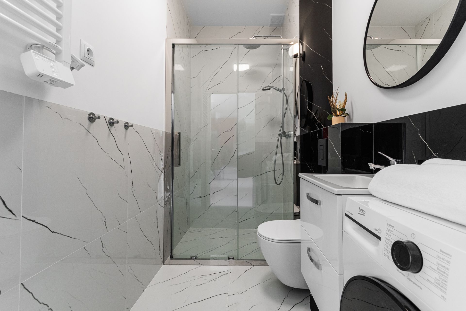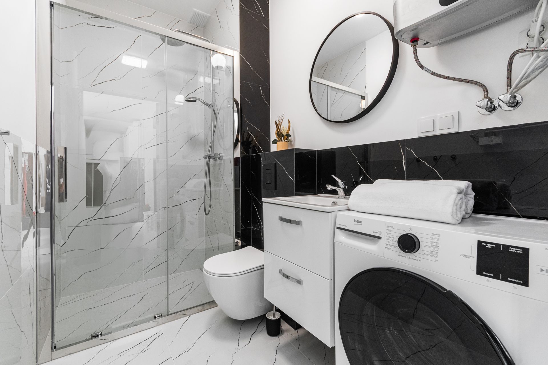 🛁 Nowoczesna łazienka z prysznicem, suszarka do włosów, żelazko i deska do prasowania