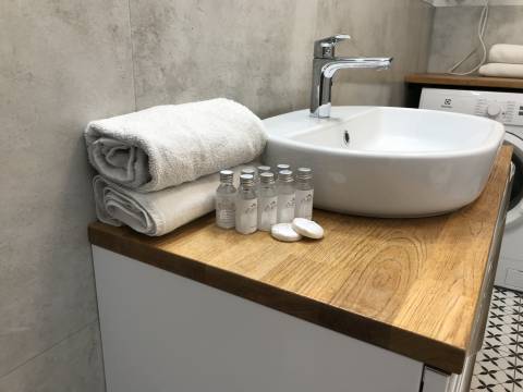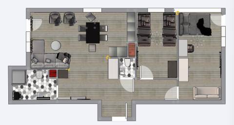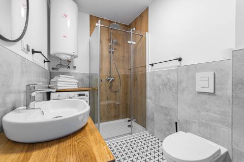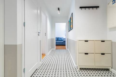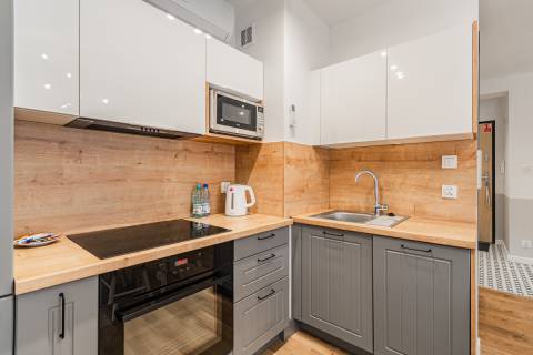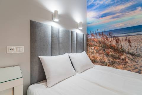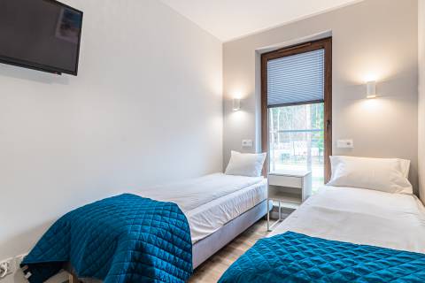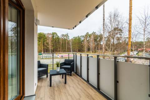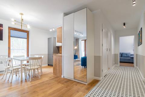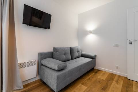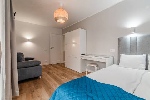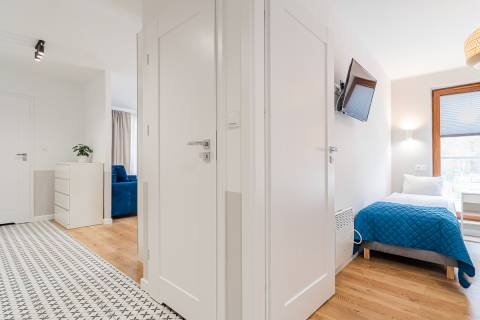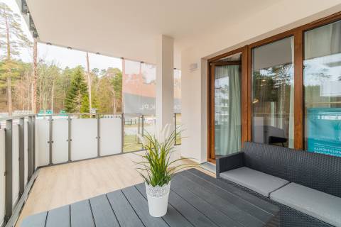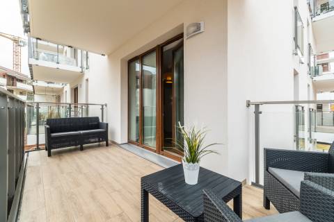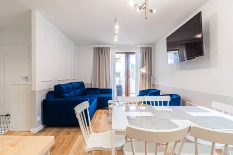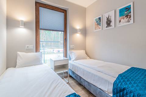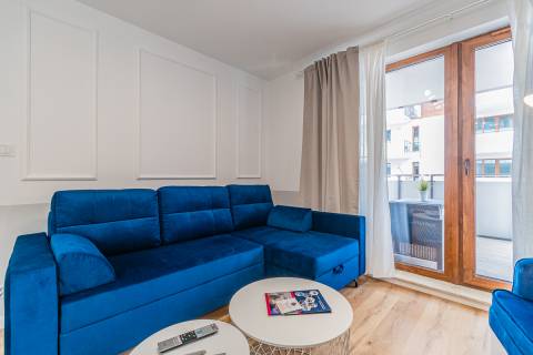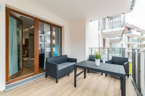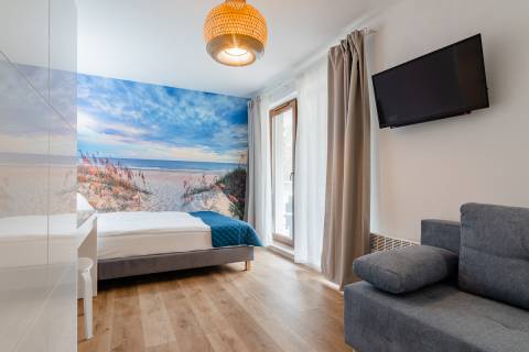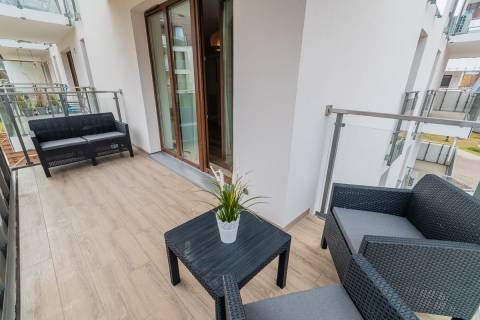 Apartament składa się z obszernego salonu z pełni wyposażonym aneksem kuchennym (zmywarka, lodówka, piekarnik, kuchenka mikrofalowa) o wystawie północno-zachodniej ze słonecznym balkonem od strony zachodniej. Salon w części wypoczynkowej wyposażony jest w dużą, narożną kanapę oraz dwa fotele. W pierwszej - mniejszej, oddzielnej sypialni (strona północna) znajdują się dwa pojedyncze łoża, telewizor oraz szafa. Druga komfortowa sypialnia z balkonem od strony wschodniej posiada podwójne łoże 140x200 cm oraz rozkładaną, dwuosobową kanapę, biurko, Tv oraz szafę. Balkony o dużej powierzchni wyposażone są w zestawy wypoczynkowe umożliwiające relaks dla dużej rodziny. W przedpokoju znajduje się pojemna szafa oraz komoda. W apartamencie znajduje się łazienka z pralką oraz oddzielne WC. Apartament wyposażony w elementy codziennego użytku takie jak suszarka do włosów, żelazko, deska do prasowania, odkurzacz. Dodatkowo w apartamencie znajduje się ekspres do kawy co daje możliwość przygotowania świeżo zmielonej, aromatycznej kawy. Lokal przeznaczony dla maksymalnie 6 osób, klimatyzacja w salonie.