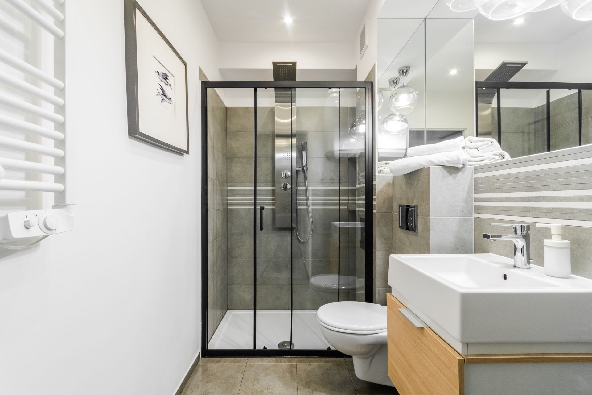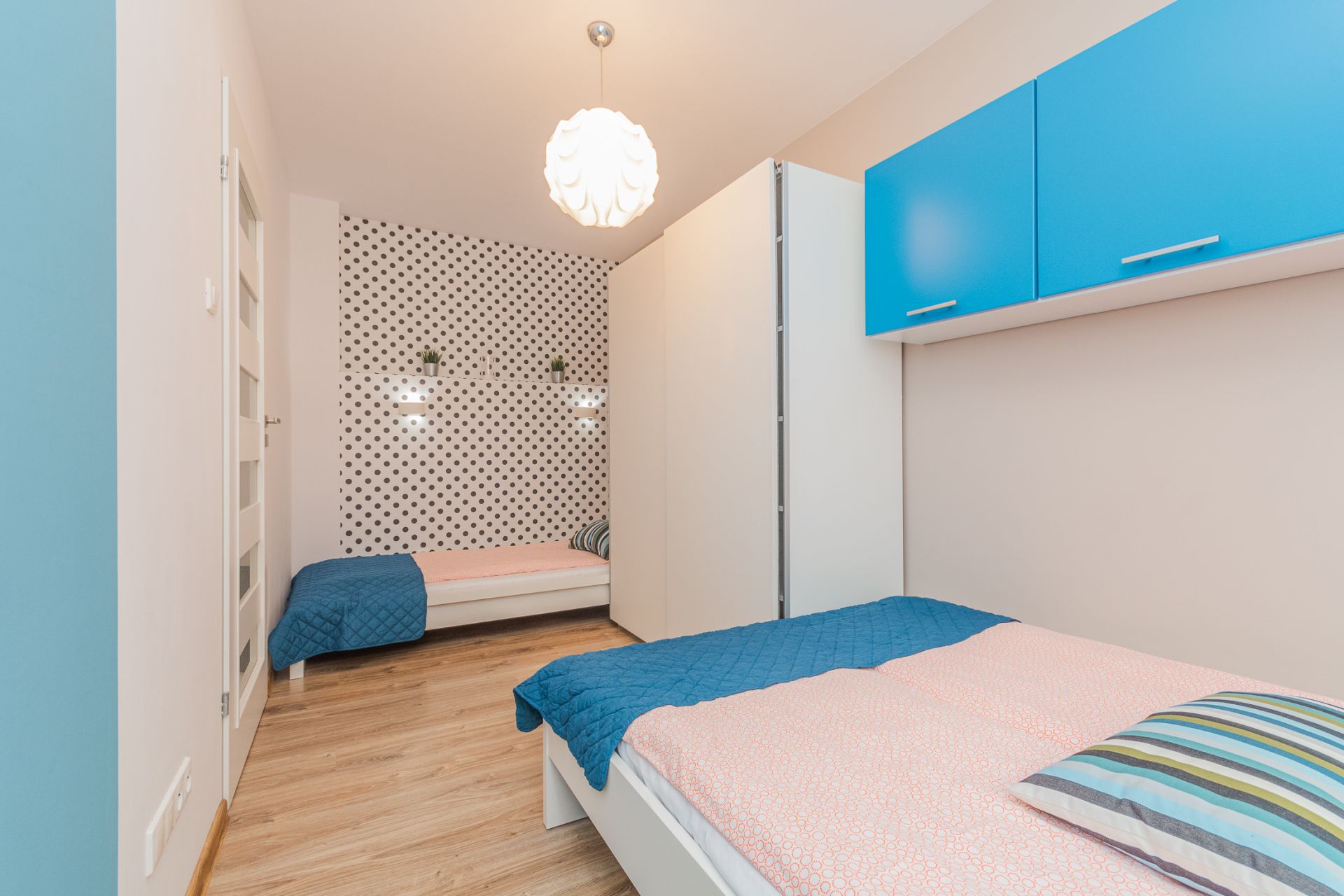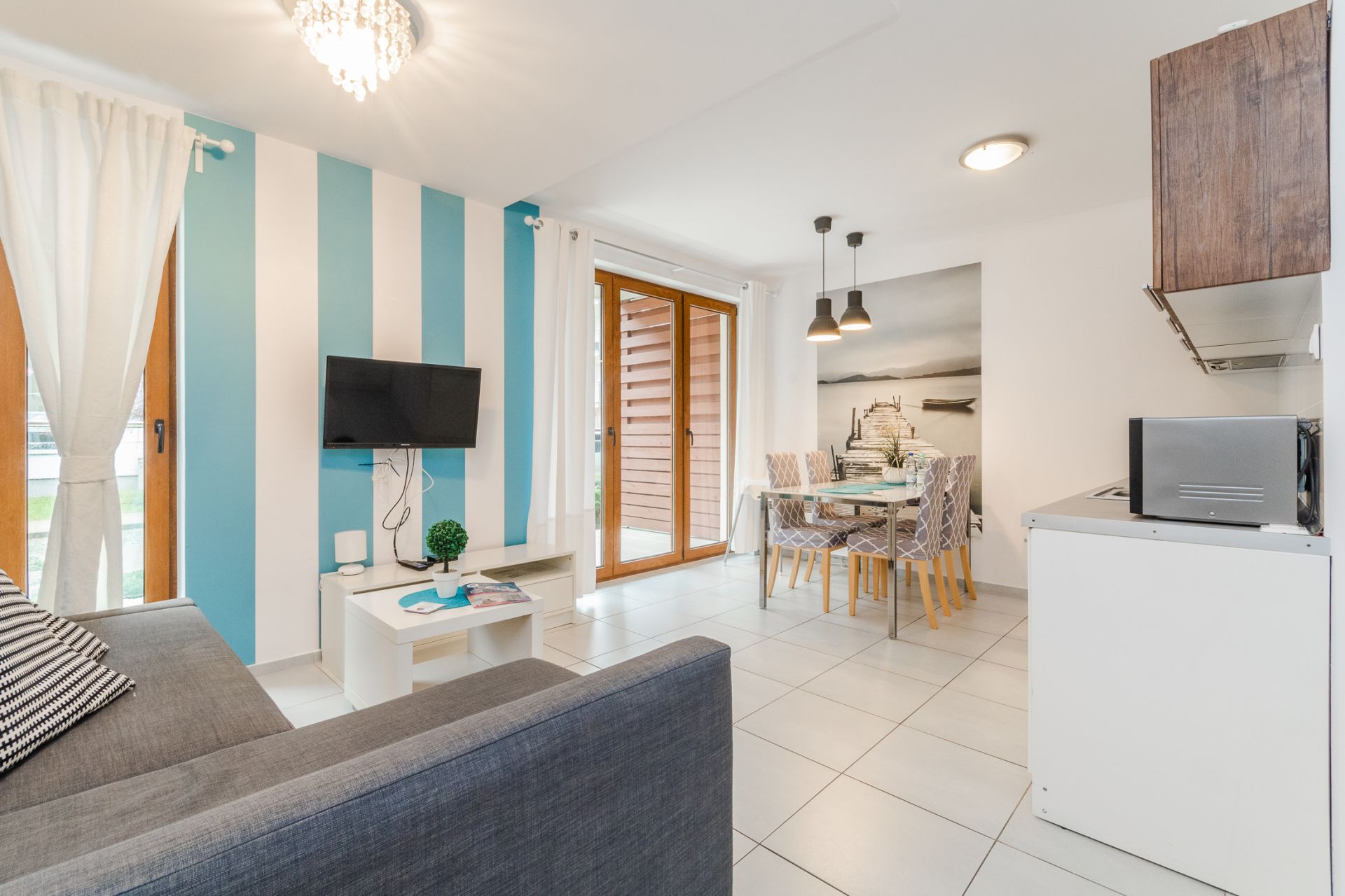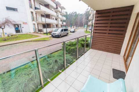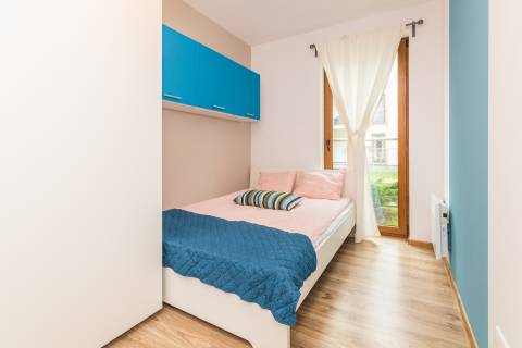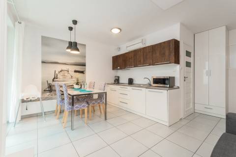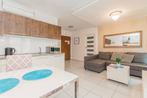 Słoneczne, jasne mieszkanie o metrażu 36m2 położone jest na parterze od strony zachodniej. Eleganckie, nowoczesne wnętrze obejmuje oddzielną sypialnię, przestronny salon, aneks kuchenny, łazienkę oraz balkon. Do dyspozycji Gości jest pięć miejsc noclegowych: łoże małżeńskie i jednoosobowe łóżko w sypialni oraz rozkładany narożnik w salonie. Gustowne dodatki nadają mieszkaniu uroku.