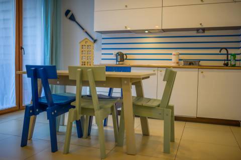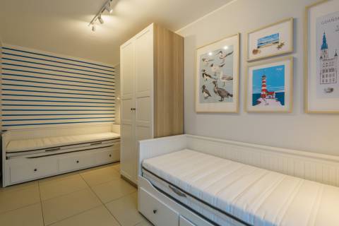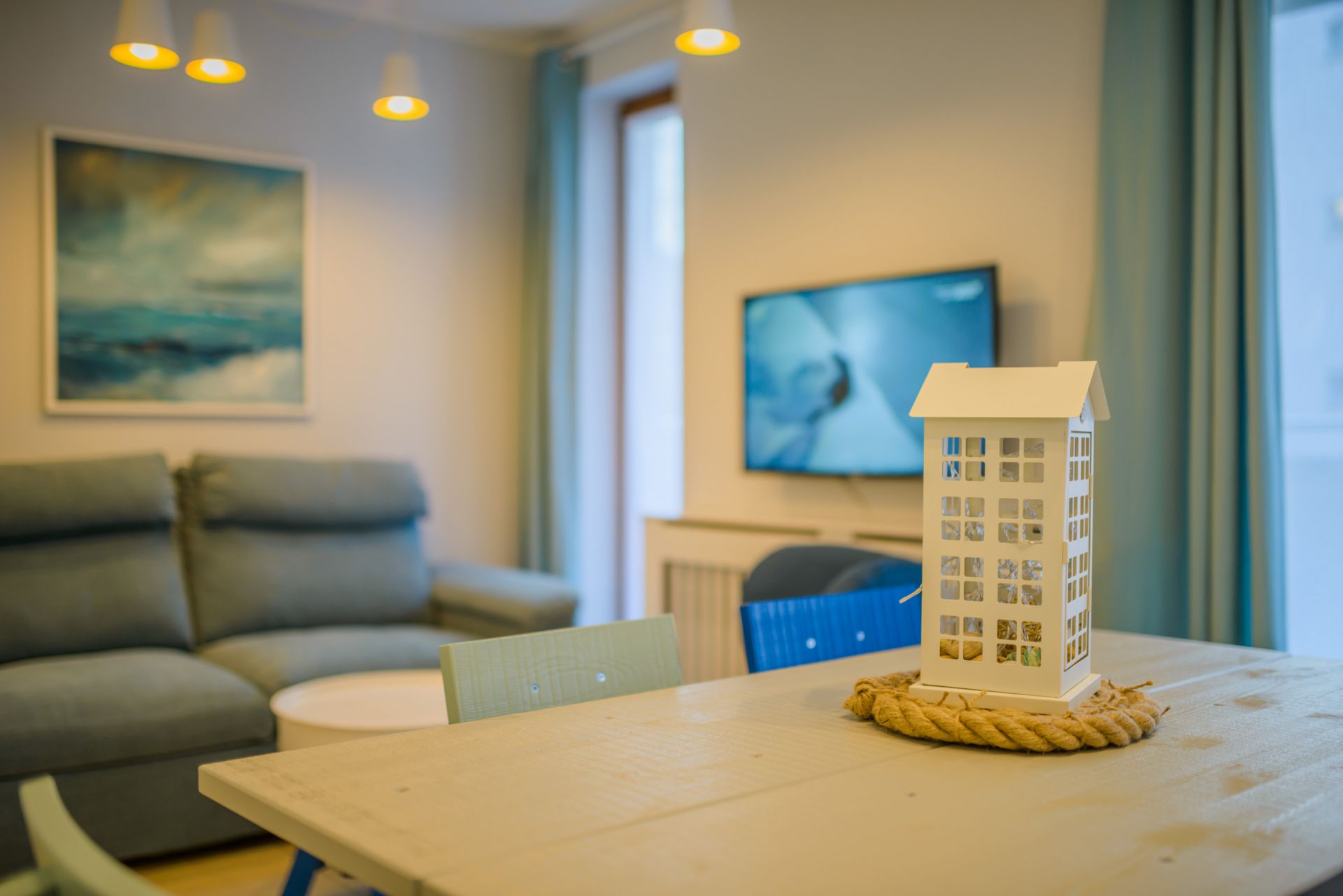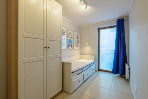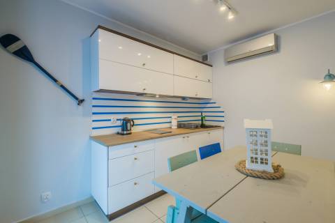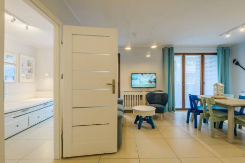 Usytuowany na I piętrze od strony zachodniej apartament ma powierzchnię 36m2. Mieszkanie utrzymane w nadmorskim klimacie. Składa się z odseparowanej sypialni, salonu połączonego z aneksem kuchennym, łazienki oraz balkonu. Miejsca noclegowe to dwa łóżka dwuosobowe w sypialni - idealny dla 4 osób. Ciekawie zaaranżowane wnętrze jest niezwykle komfortowe i funkcjonalne.