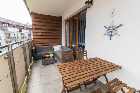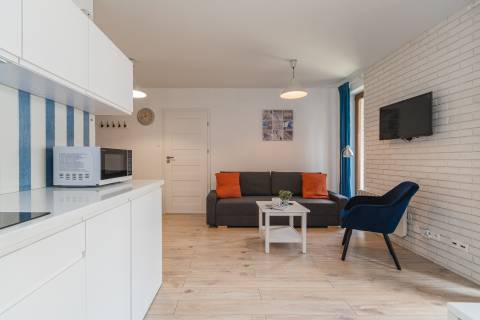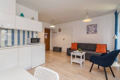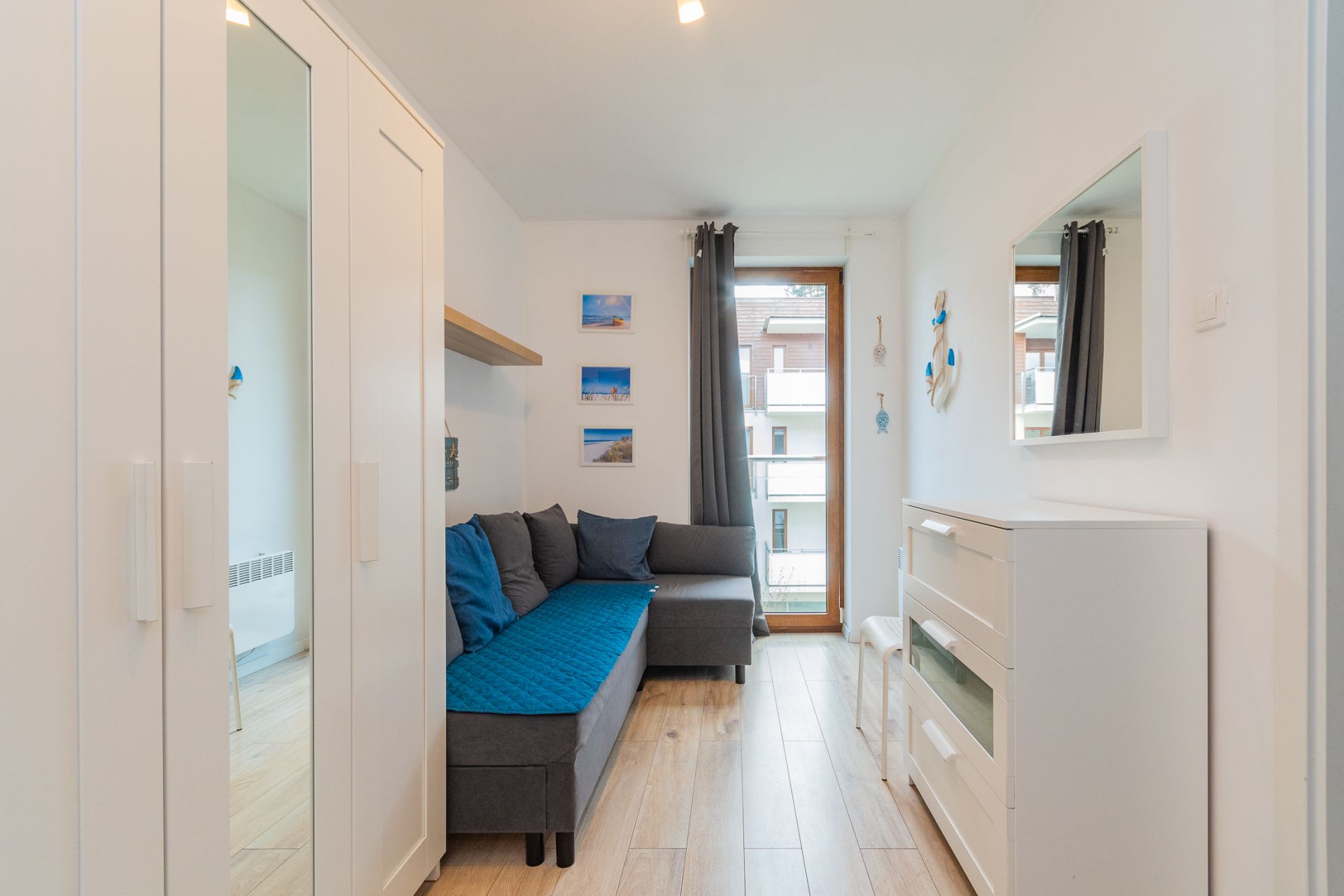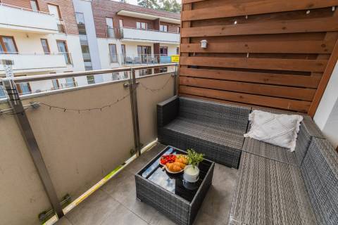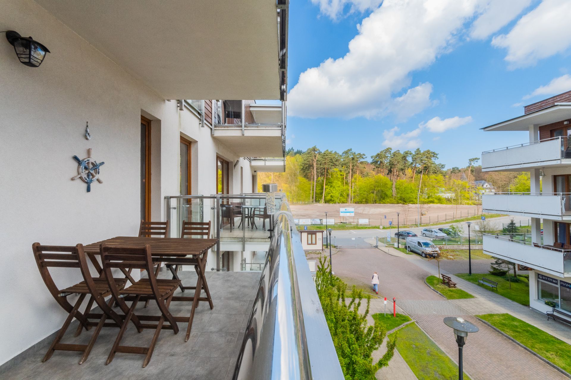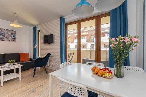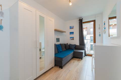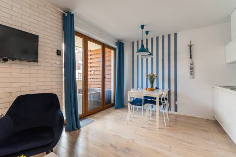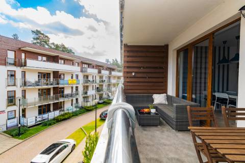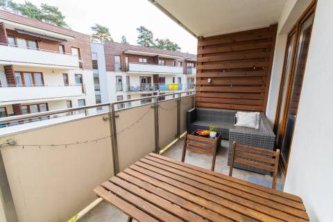 Bardzo przytulny apartament o metrażu 36m2 mieści się na II piętrze od strony wschodniej. Składa się z odseparowanej sypialni, salonu wypoczynkowego, łazienki oraz balkonu. Idealny dla pięciu osób. W zamykanej sypialni znajduje się dwuosobowy, rozkładany narożnik oraz łóżko jednoosobowe. Salon za sprawą rozkładanego narożnika jest miejscem do spania dla dwóch osób. Z prywatnego balkonu można zobaczyć kawałek lasu. Jeżeli oczekujesz komfortowego wypoczynku, tutaj będziesz czuć się doskonale.