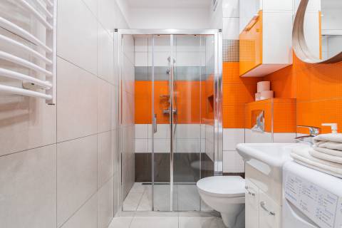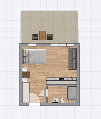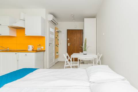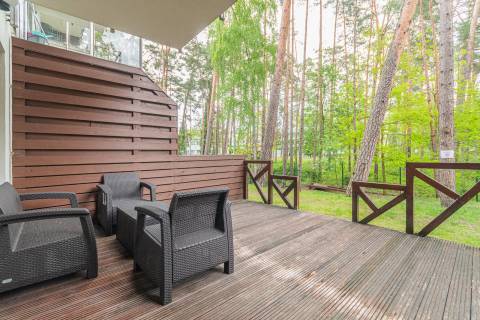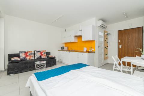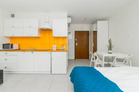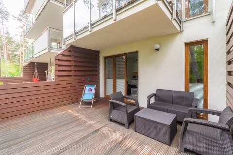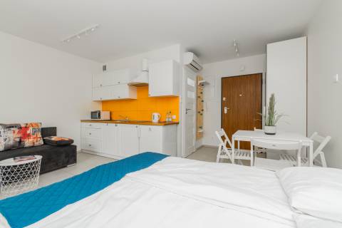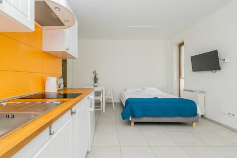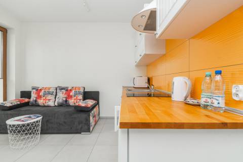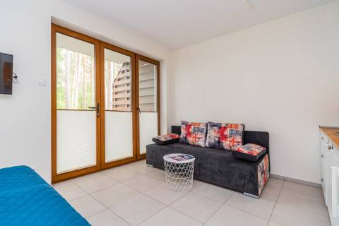 Apartament mieści się na parterze od strony wschodniej. Składa się z salonu, który połączony jest z aneksem kuchennym oraz łazienki. Z apartamentu jest bezpośrednie wyjście na taras, który daje poczucie prywatności, jest miejscem do relaksu i czasu tylko dla siebie. Mieszkanie zapewnia warunki do wypoczynku dla czterech osób. Łoże małżeńskie o powierzchni spania 140x200 cm oraz rozkładana dwuosobowa kanapa tworzą wygodne miejsca noclegowe.