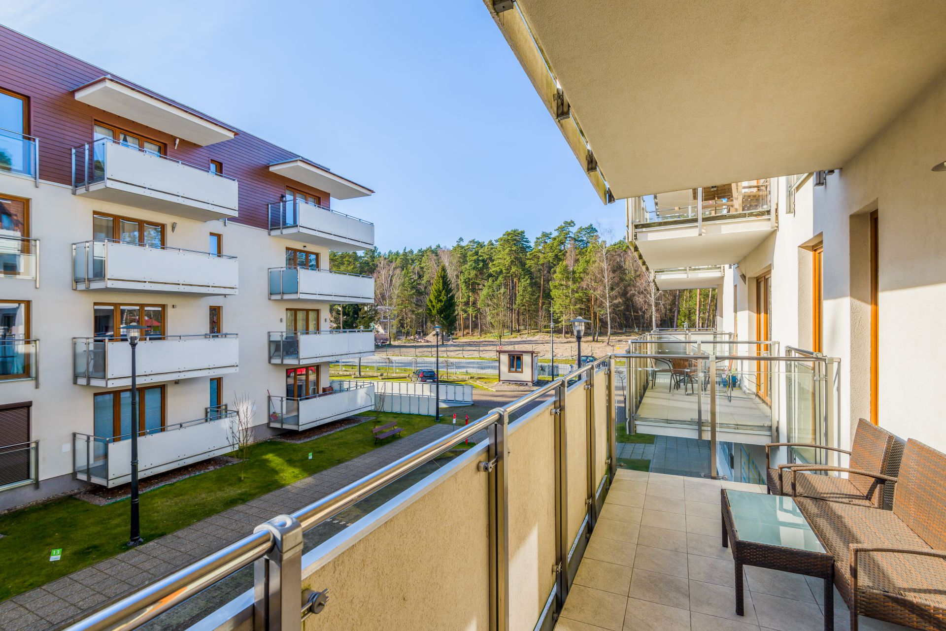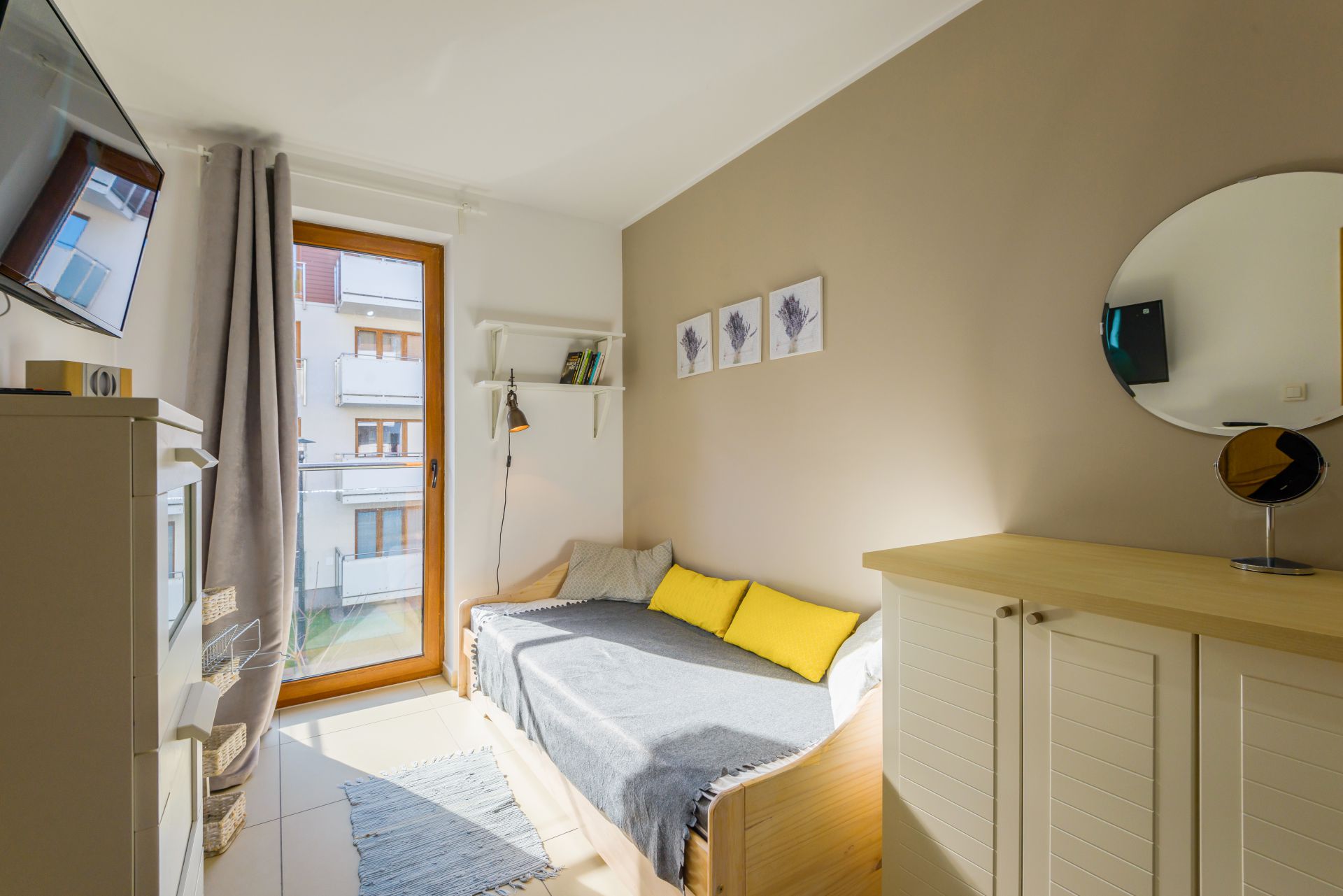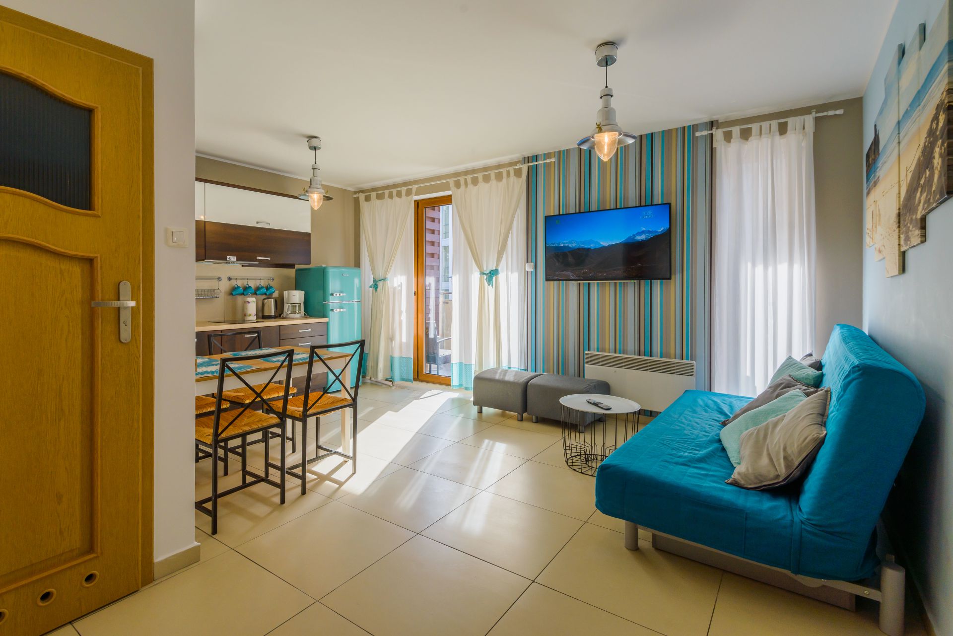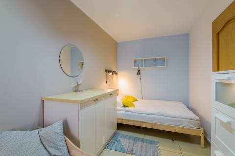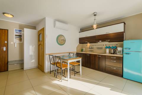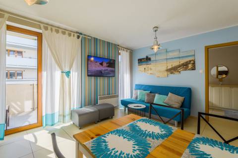 Ciekawie zaaranżowany apartament mieści się na I piętrze od strony zachodniej. Jego powierzchnia to 36m2. Wnętrze obejmuje zamykaną sypialnię, salony połączony z w pełni wyposażonym aneksem kuchennym, łazienkę oraz balkon. Łazienka niedawno przeszła gruntowny remont i zachwyca swoją aranżacją i funkcjonalnością. Do dyspozycji Gości jest sześć miejsc noclegowych: łóżko pojedyncze z możliwością rozłożenia tak, aby było podwójne i jedno łóżko podwójne w sypialni oraz rozkładana, dwuosobowa kanapa w salonie. Dodatkowo mieszkanie jest wyposażone w dwa telewizory. Mieszkanie z pewnością przypadnie do gustu osobom, szukającym wytchnienia w dogodnych warunkach.