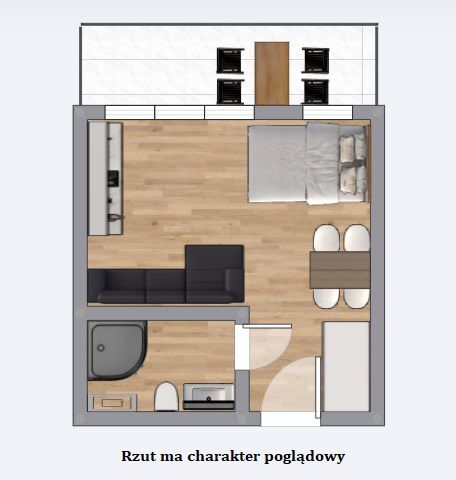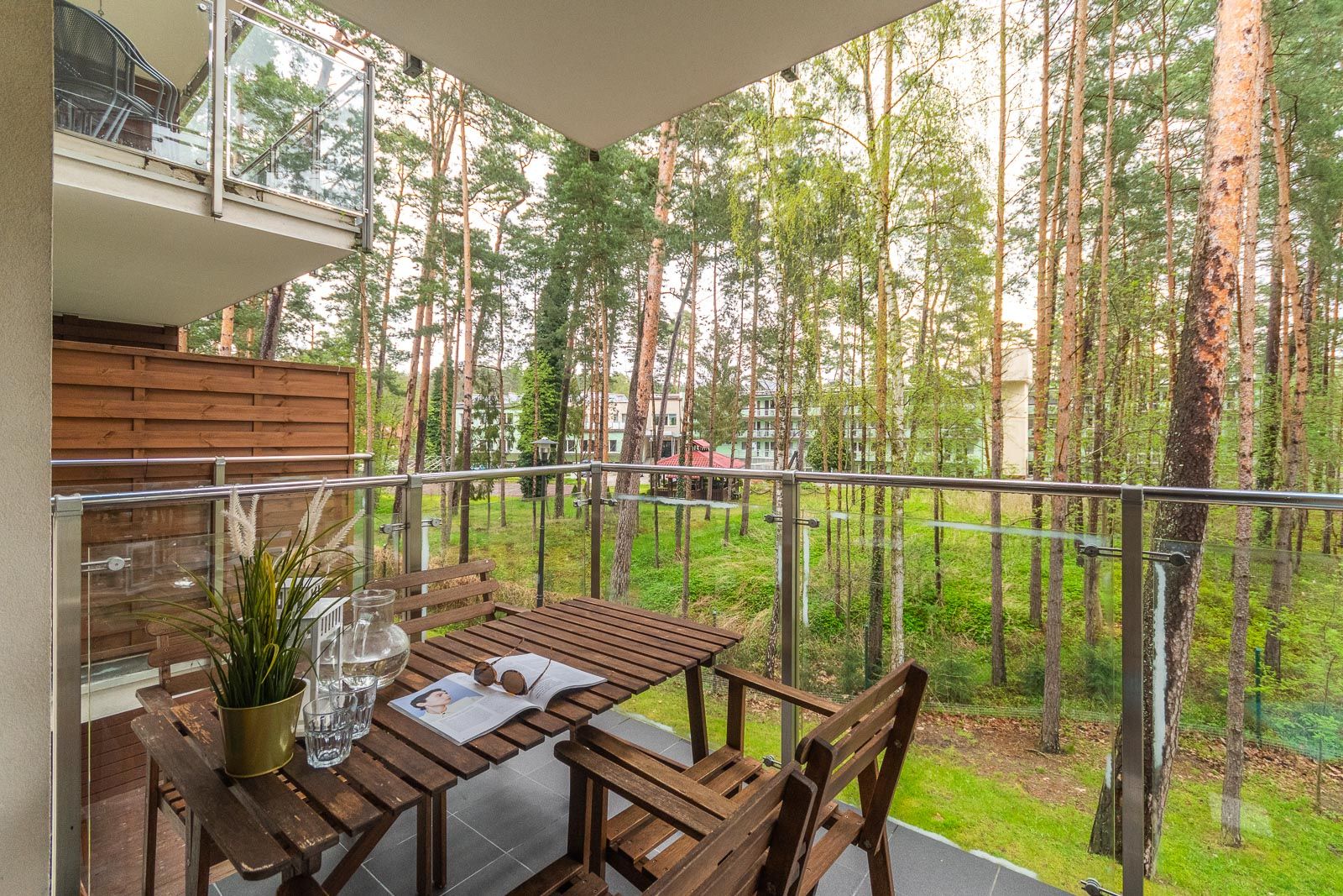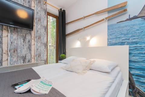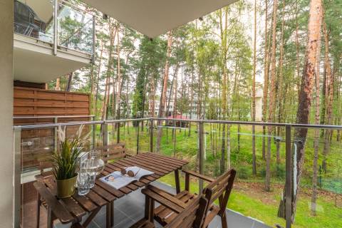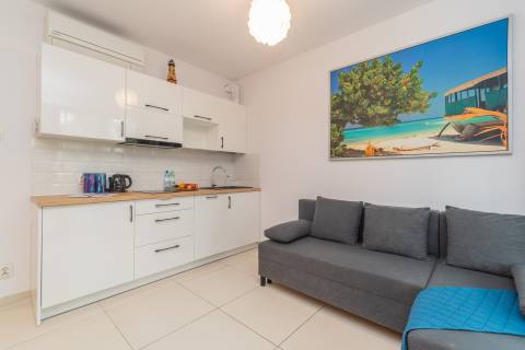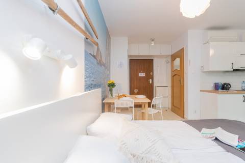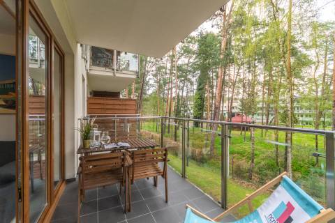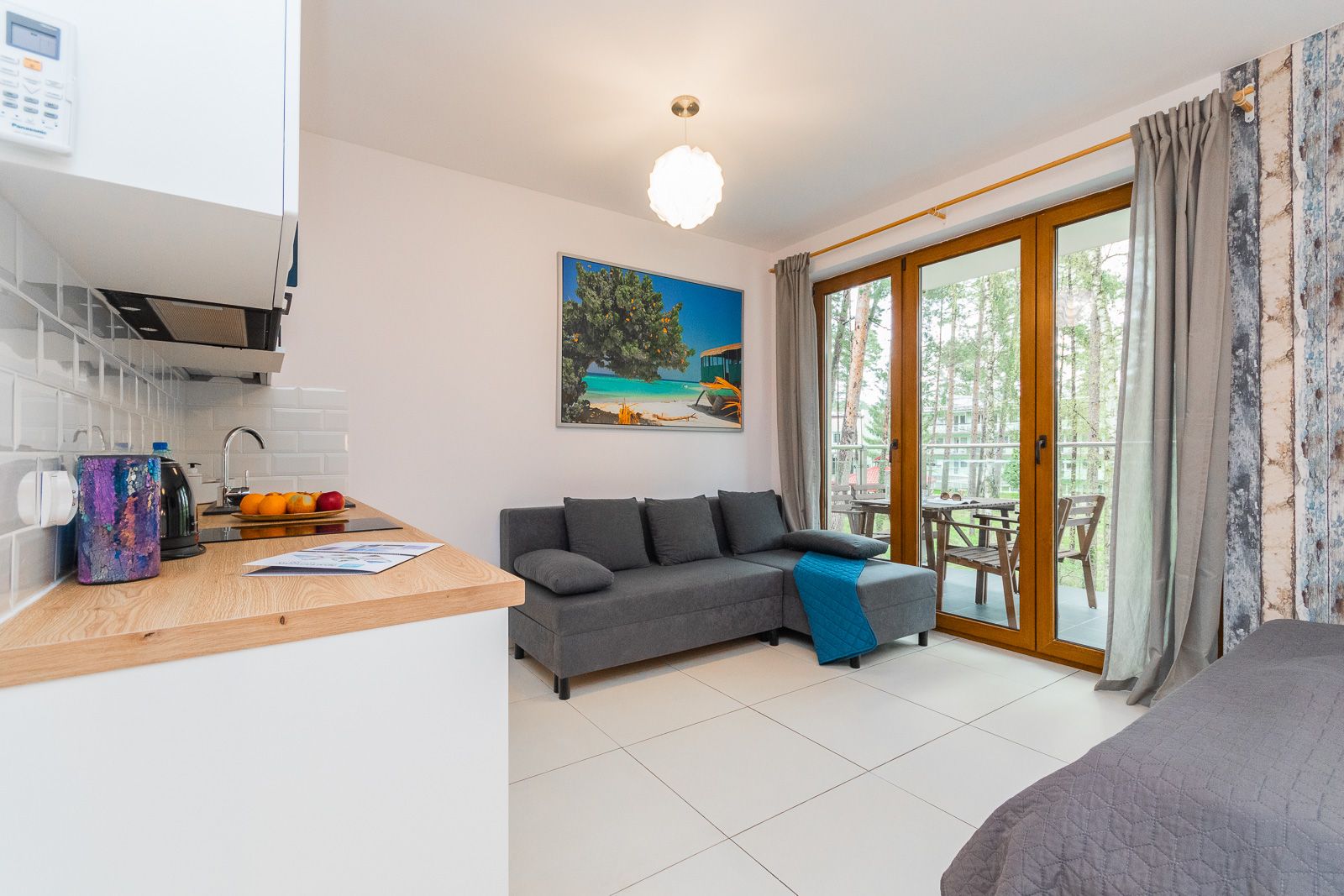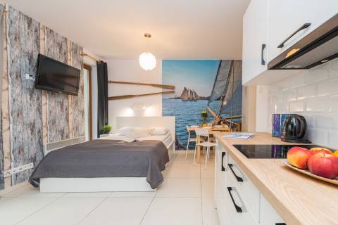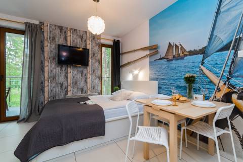 Niezwykle przytulny apartament o powierzchni 24m2 usytuowany jest na I piętrze od strony wschodniej. Składa się z salonu połączonego z aneksem kuchennym, łazienki oraz balkonu. Miejsca noclegowe to łoże małżeńskie oraz rozkładana dwuosobowa sofa. Goście mają możliwość podziwiania z balkonu widoku na las. Idealne miejsce do relaksu. Dzięki wystrojowi i dokładnie dobranym dodatkom w mieszkaniu panuje prawdziwie morski klimat.