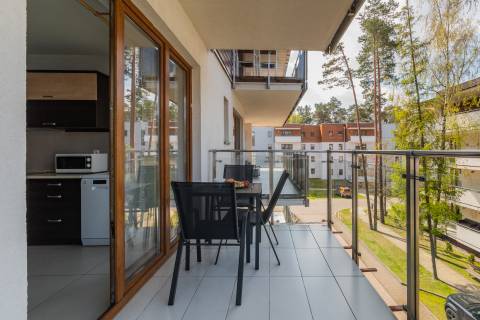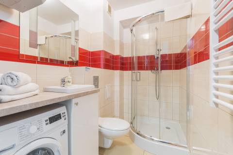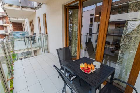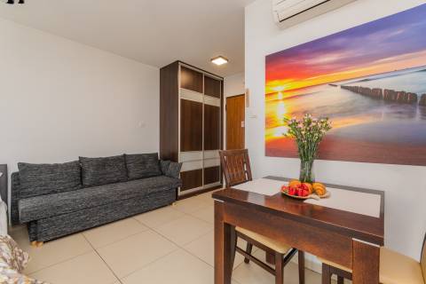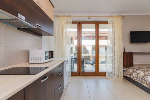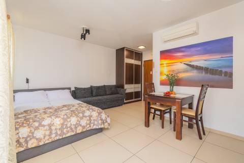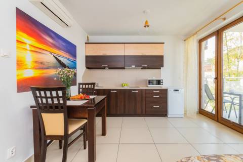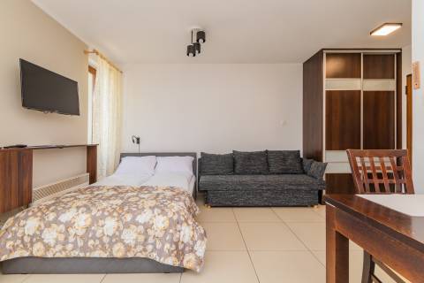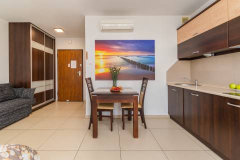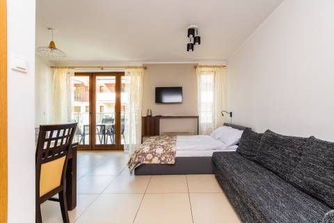 Komfortowy apartament z balkonem, na II piętrze, położony od strony zachodniej. Składa się z salonu z w pełni wyposażonym aneksem kuchennym oraz łazienki. Idealne studio dla par. Do dyspozycji gości: łoże małżeńskie oraz rozkładana jednoosobowa sofa typu amerykanka. W budynku działa cichobieżna winda.