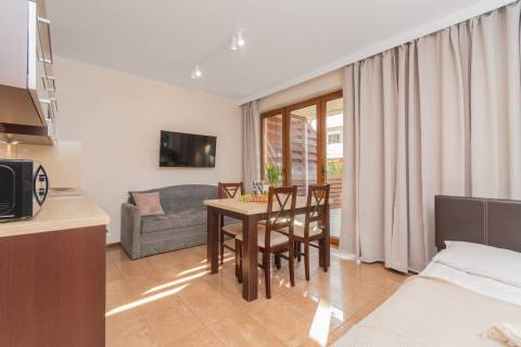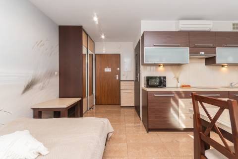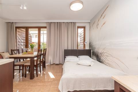 Zaledwie 500 metrów od malowniczej plaży w Stegnie znajduje się przytulne studio o powierzchni 24 m², idealne dla maksymalnie 4 osób. Apartament, położony na parterze, dysponuje tarasem, na którym można zrelaksować się po dniu spędzonym nad morzem. Studio składa się z części dziennej, w której znajduje się łoże małżeńskie oraz rozkładana kanapa, zapewniająca dodatkowe miejsca do spania. Dzięki klimatyzacji pobyt w upalne dni jest wyjątkowo komfortowy. W apartamencie znajdziesz również udogodnienia, takie jak pralka oraz zmywarka, co sprawia, że jest to świetna opcja na dłuższy pobyt. Dodatkowo, możliwy jest przyjazd ze zwierzętami, dzięki czemu możesz zabrać swojego pupila na wakacje! Dzięki swojej lokalizacji, apartament stanowi doskonałą bazę wypadową do zwiedzania okolicy, jak i relaksu na plaży, do której dotrzesz w zaledwie kilka minut spacerem.