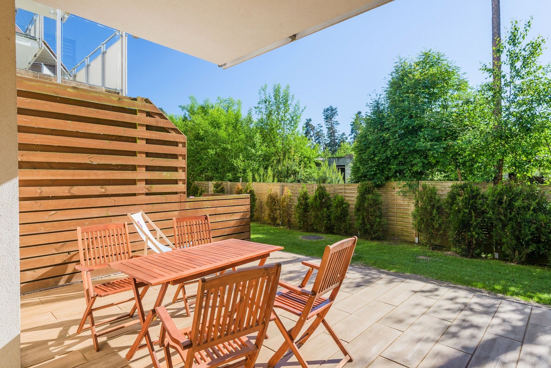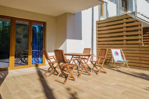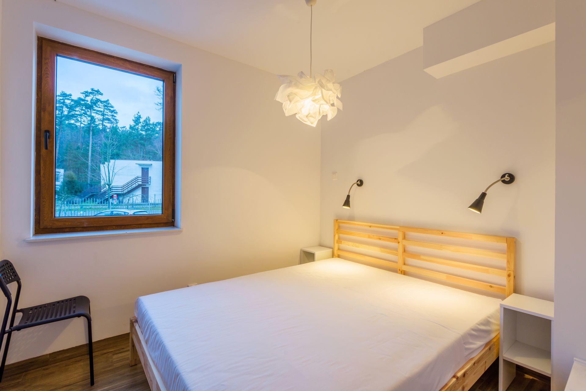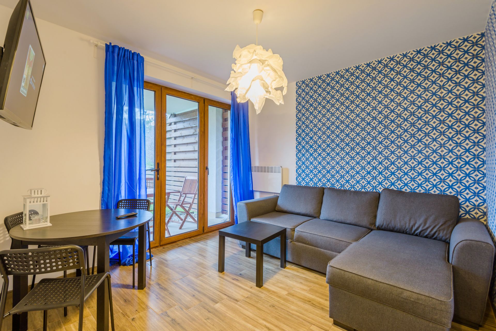 Apartament mieści się na parterze od strony zachodniej i składa się z niezależnej sypialni, salonu połączonego z w pełni wyposażonym aneksem kuchennym oraz łazienki. Jego powierzchnia to 33m2. Do apartamentu przynależy taras z bezpośrednim wyjściem na teren zielony dookoła budynku. W mieszkaniu panują dogodne warunki na pobyt dla czterech osób. W sypialni znajduje się łoże małżeńskie, a w salonie jest rozkładany narożnik, będący miejscem do spania dla dwóch osób. Mieszkanie jest bardzo przytulne i urządzone w nowoczesnym stylu.