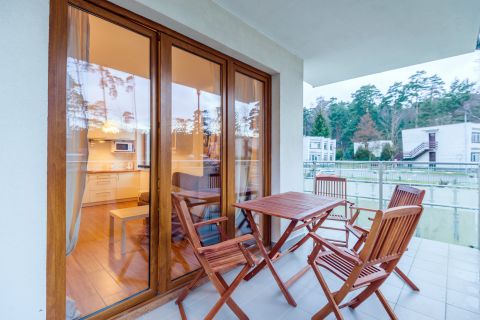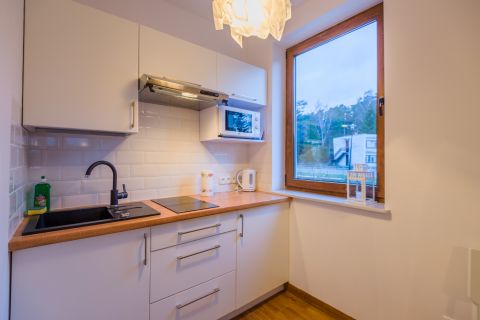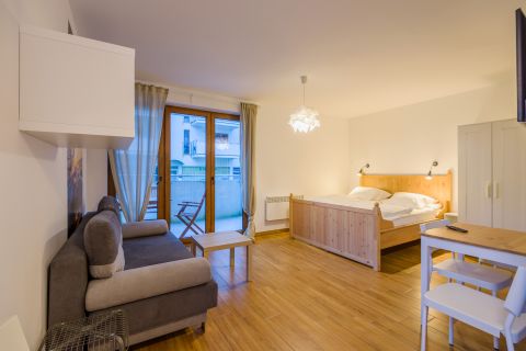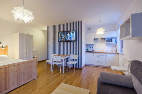 Apartament typu studio położony jest na parterze od strony wschodniej. Powierzchnia mieszkania to 26m2. Apartament przeznaczony jest dla maksymalnie czterech osób. Komfortowy wypoczynek zapewnia łoże małżeńskie oraz rozkładana dwuosobowa sofa. Mieszkanie składa się z salonu i aneksu kuchennego, łazienki oraz balkonu. Swobodnie będzie się tu czuła para, rodzina z dziećmi czy też grupa znajomych!
