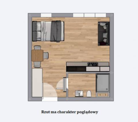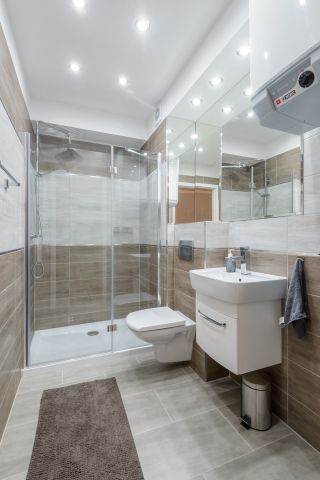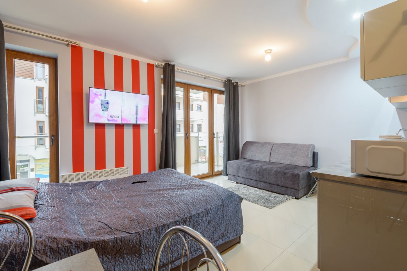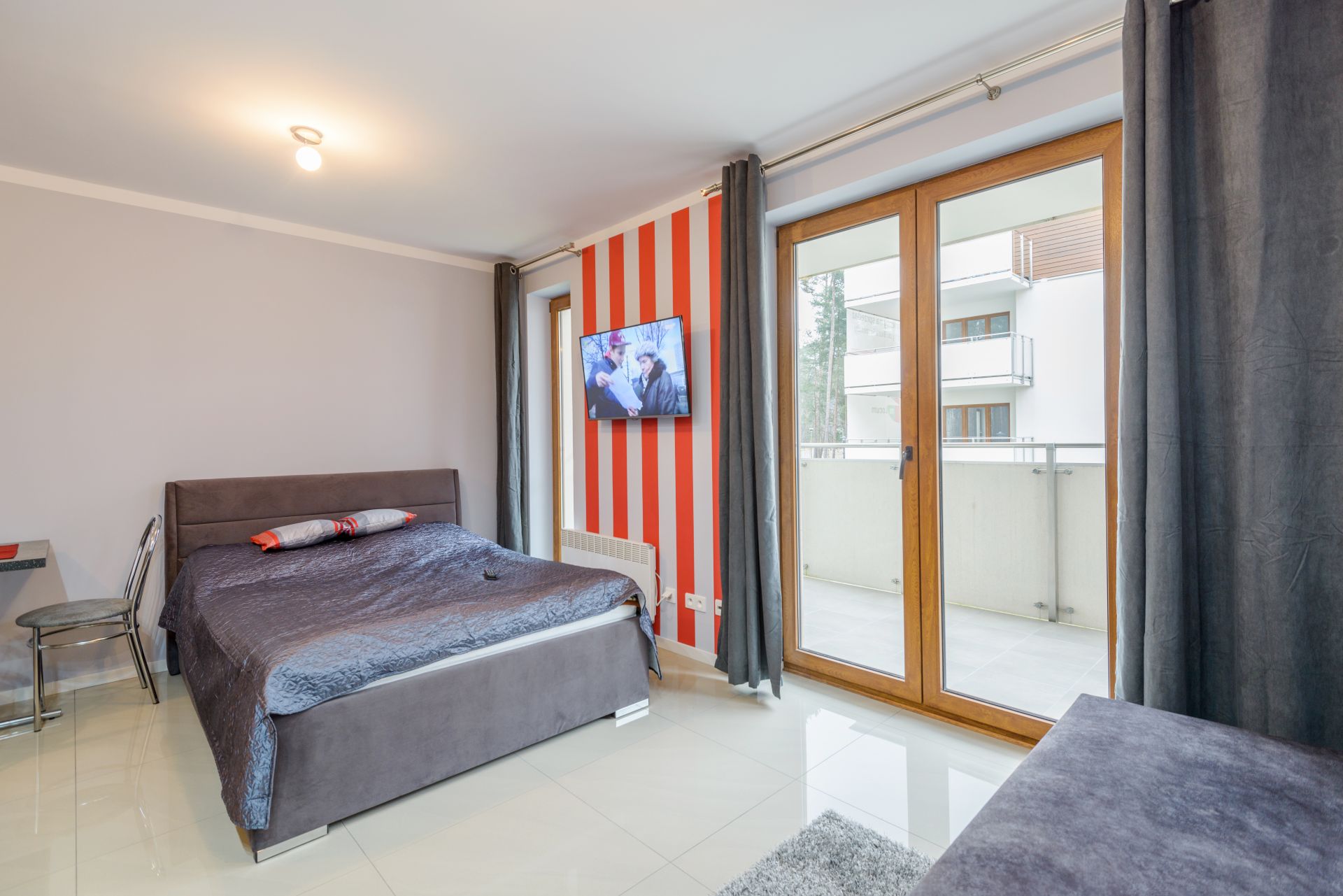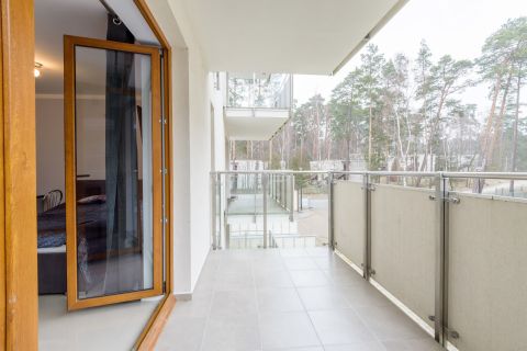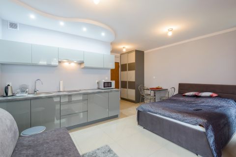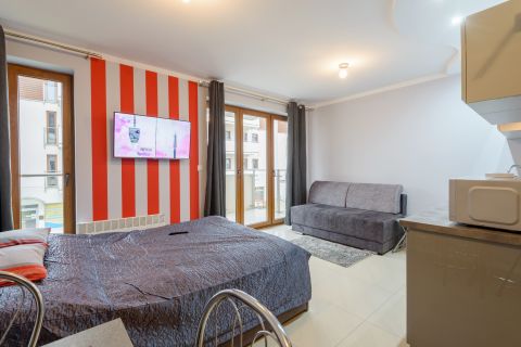 Apartament jest niewielki, ale niezwykle funkcjonalny. Mieści się na I piętrze od strony wschodniej. Składa się z salonu połączonego z aneksem kuchennym, łazienki oraz balkonu. Metraż 24m2 obejmuje miejsca noclegowe dla czterech osób: łoże małżeńskie oraz rozkładaną dwuosobową sofę. Starannie dobrane dodatki nadają wnętrzu nowoczesności.