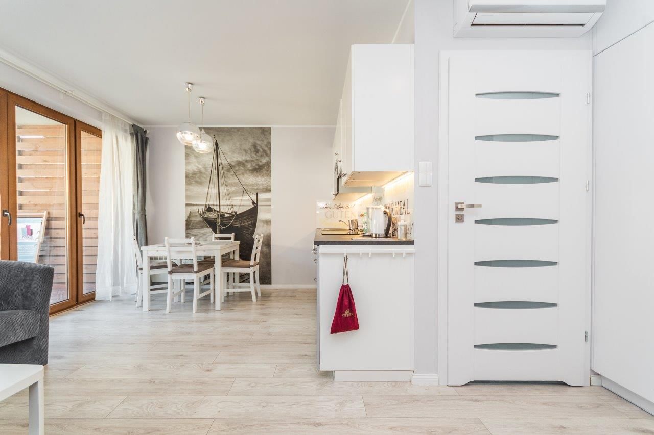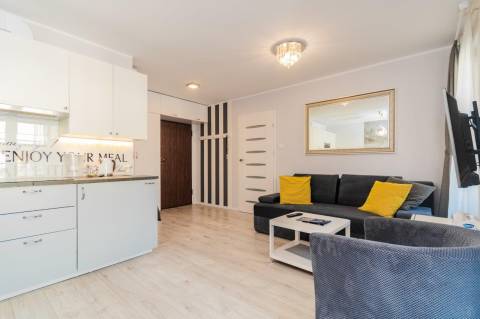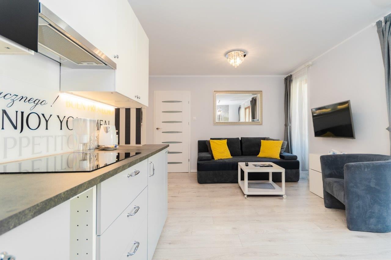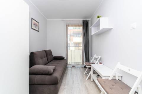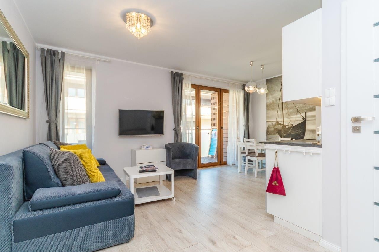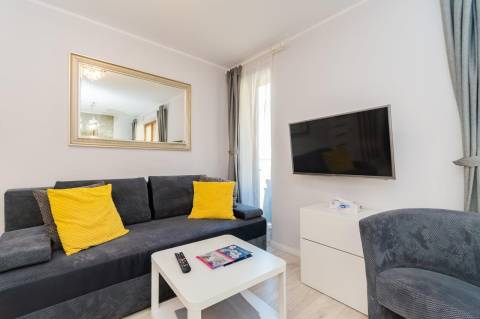 Komfortowy apartament o powierzchni 36m2 położony na II piętrze od strony wschodniej. Składa się z salonu z pełni wyposażonym aneksem kuchennym, sypialni, łazienki oraz przestronnego balkonu. Do dyspozycji Gości jest sześć miejsc noclegowych: łóżko małżeńskie w sypialni a także sofa rozkładana dla 1 osoby oraz rozkładana dwuosobowa kanapa w salonie. Mieszkanie jest nowoczesne i zadbane, a oryginalne dodatki nadają mu charakteru. Zdecydowanie miejsce dla Gości lubiących elegancję i niebanalny styl, równocześnie oczekujących komfortowego wypoczynku.