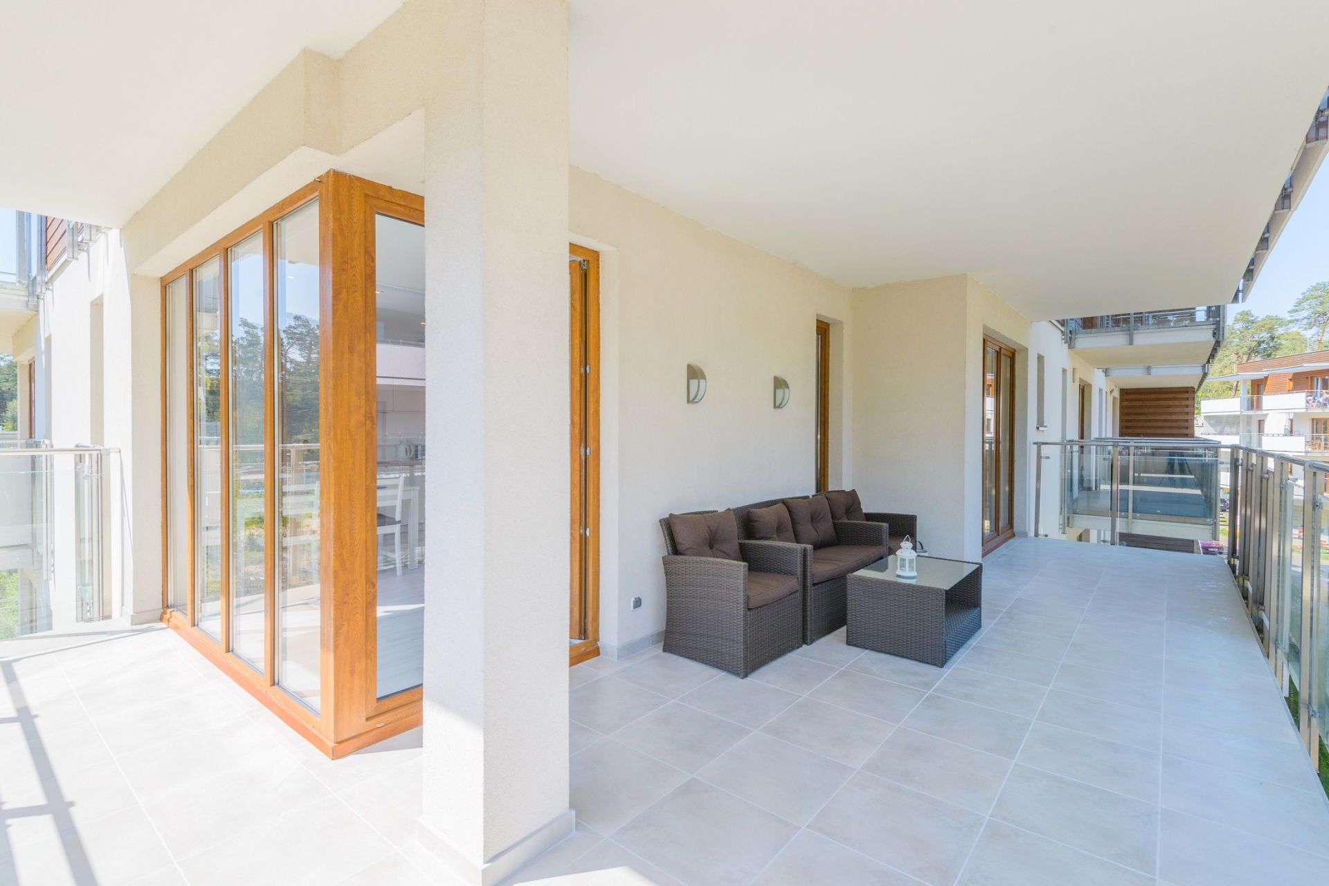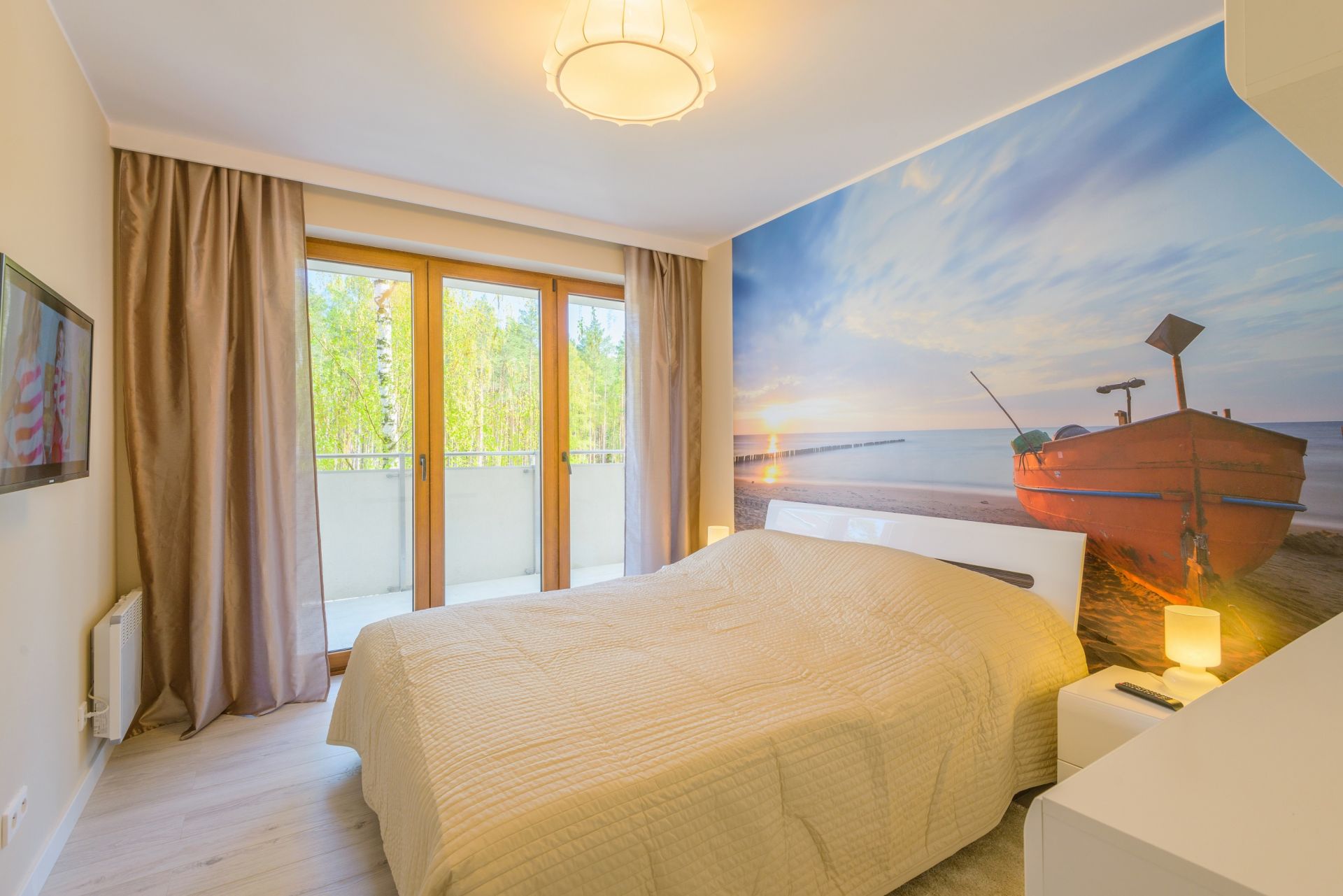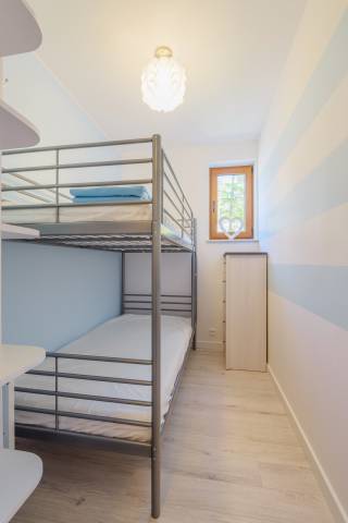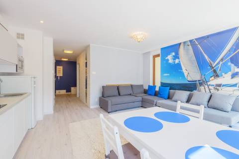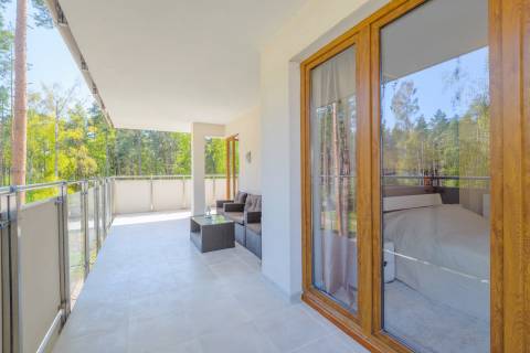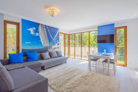 Duży apartament o powierzchni 50m2 położony jest na II piętrze. Ekspozycja wschodnio-południowa. Na funkcjonalne wnętrze składa się salon zintegrowany z aneksem kuchennym, dwie zamykane sypialnie, łazienka oraz balkon. Mieszkanie przystosowane jest dla maksymalnie sześcioosobowej grupy. W jednej sypialni znajduje się łoże małżeńskie, w drugiej łóżko piętrowe. W salonie umieszczono dwie rozkładane dwuosobowe kanapy. Z obszernego balkonu podziwiać można sosnowy las, rozkoszować się pięknem natury oraz słuchać śpiewu ptaków. Wnętrze zostało stylowo zaprojektowane. Mieszkanie jest dobrze oświetlone i jasne. Idealne miejsce na spokojny wypoczynek rodziny lub grupy znajomych.