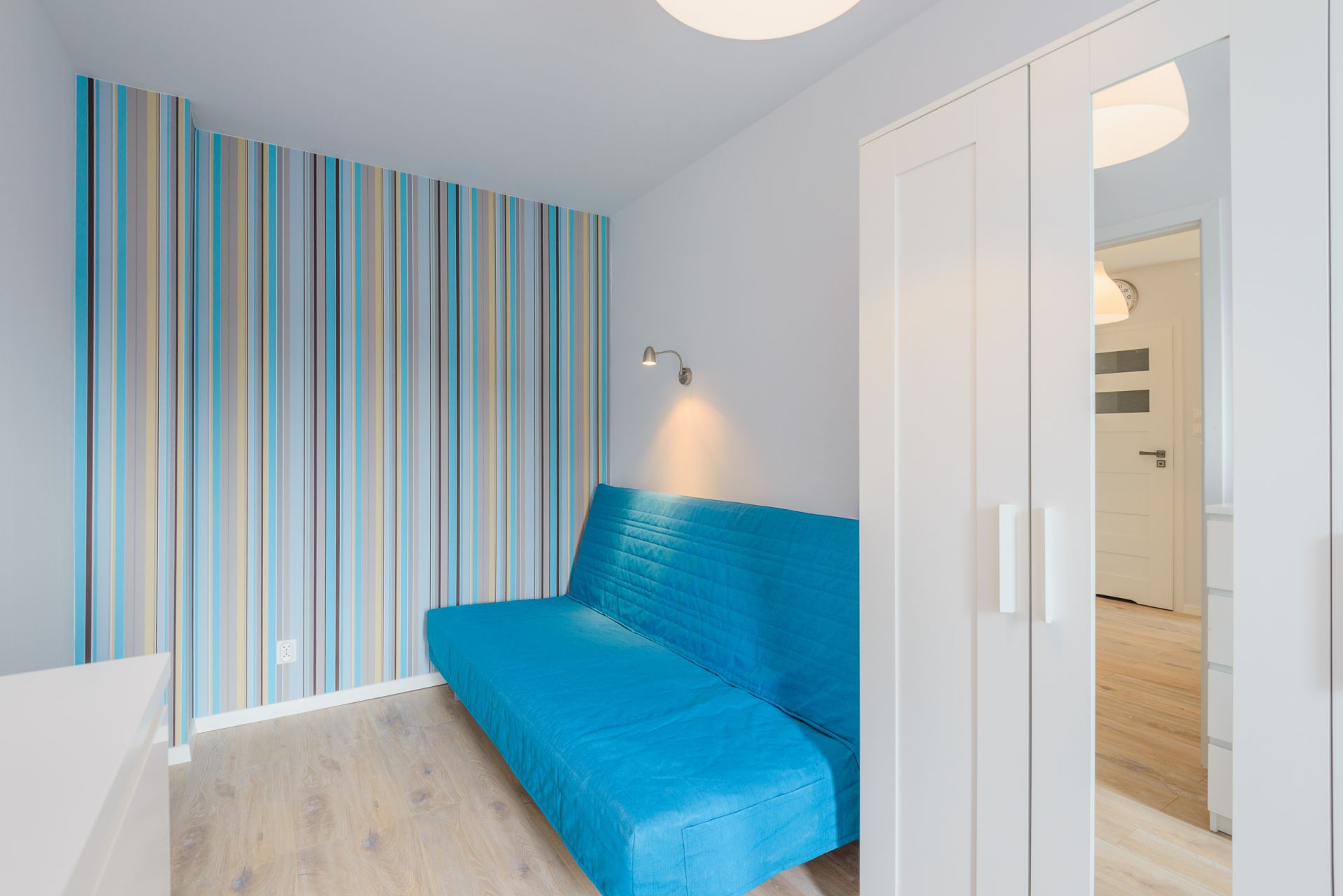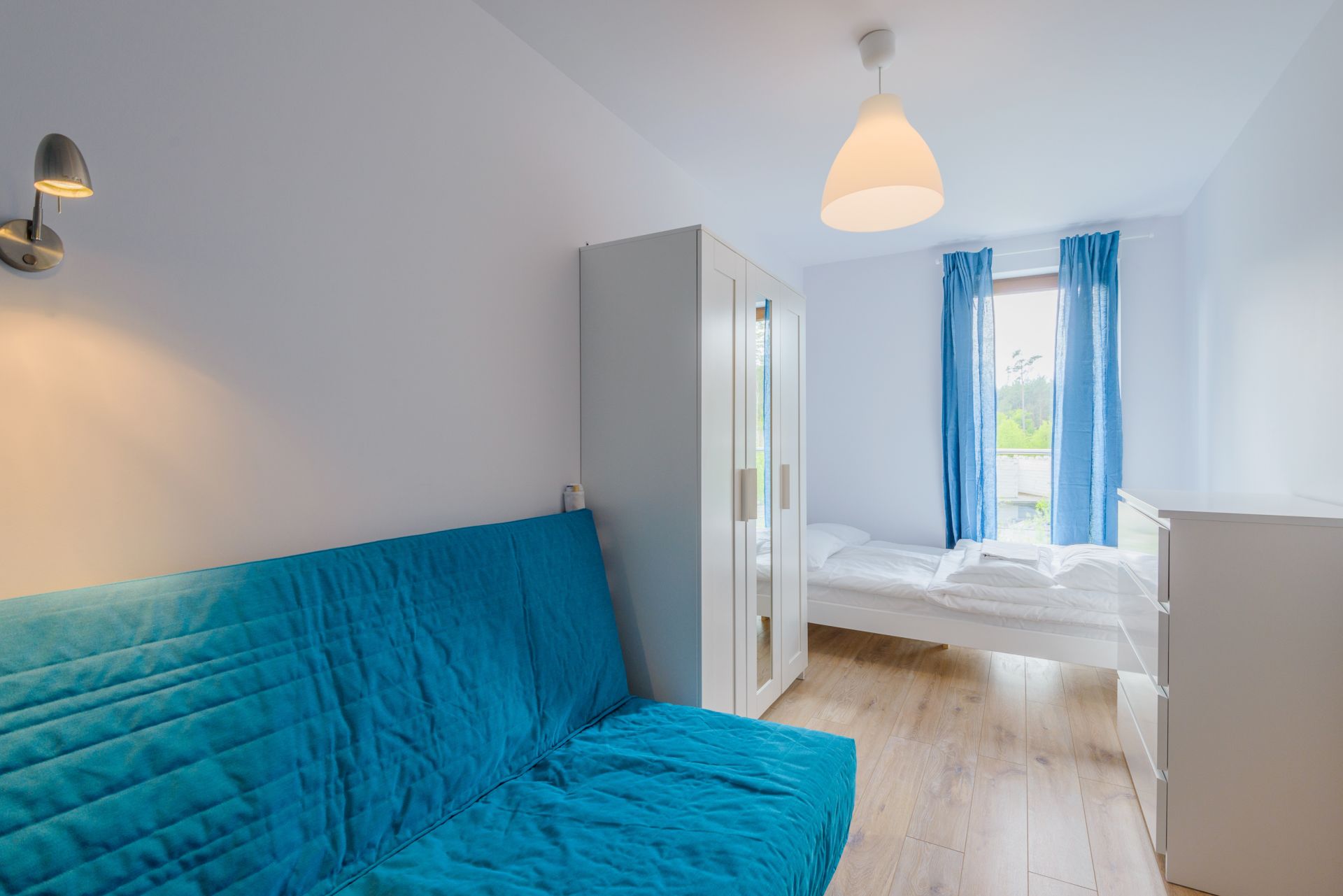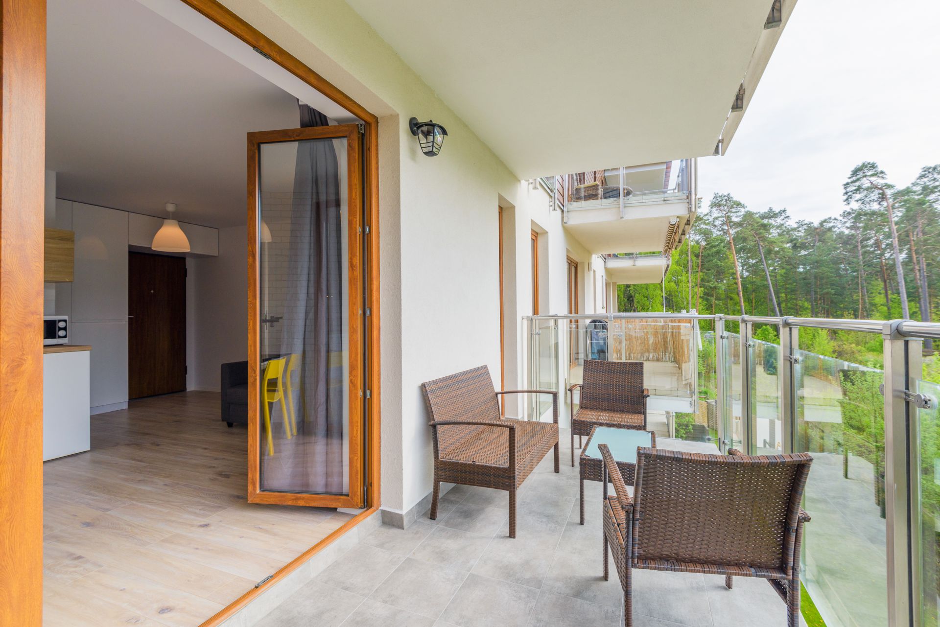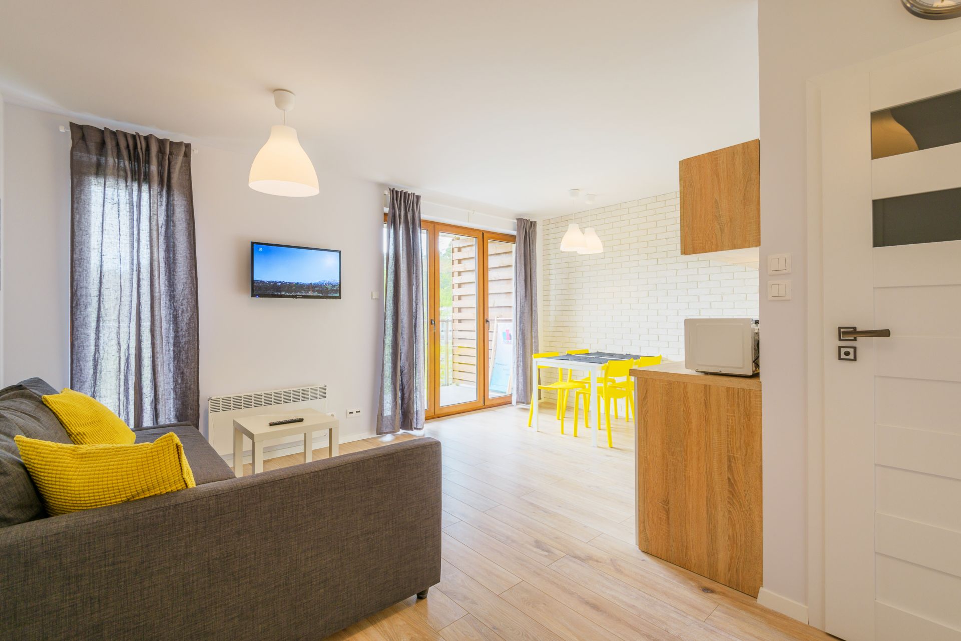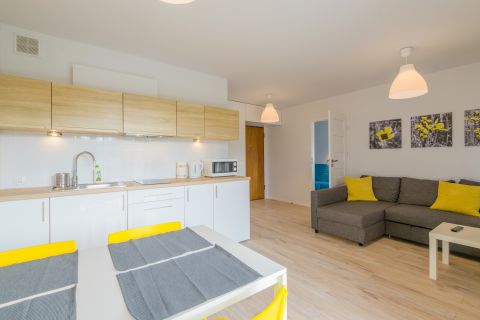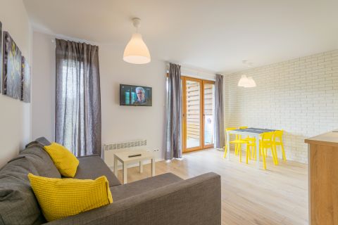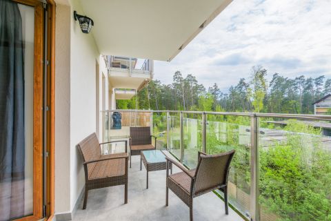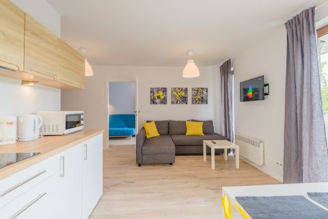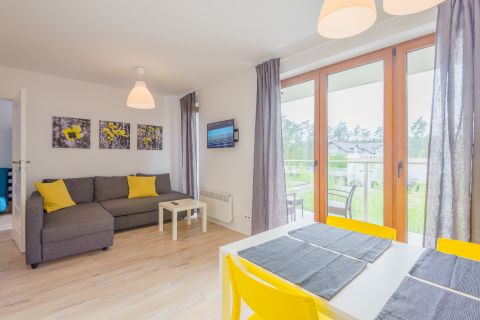 Prezentowany apartament mieści się na II piętrze od strony zachodniej. Jego powierzchnia wynosi 36m2. Przestronne wnętrze obejmuje niezależną sypialnię, salon i aneks kuchenny, łazienkę oraz balkon, z którego widać część lasu. Miejsca noclegowe to rozkładany narożnik dwuosobowy w salonie, w sypialni znajduje się jedno łóżko pojedyncze oraz rozkładana, dwuosobowa kanapa, co sprawia, że z pobytu w tym apartamencie może korzystać aż pięć osób. Starannie dobrane dodatki nadają pomieszczeniom przytulnego klimatu, dzięki czemu pobyt staje się przyjemniejszy.