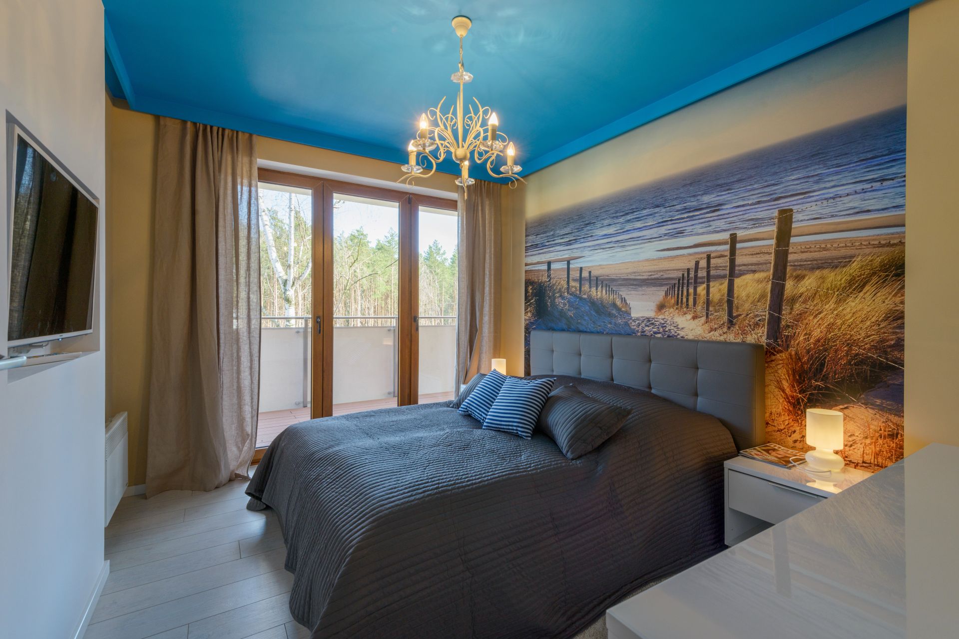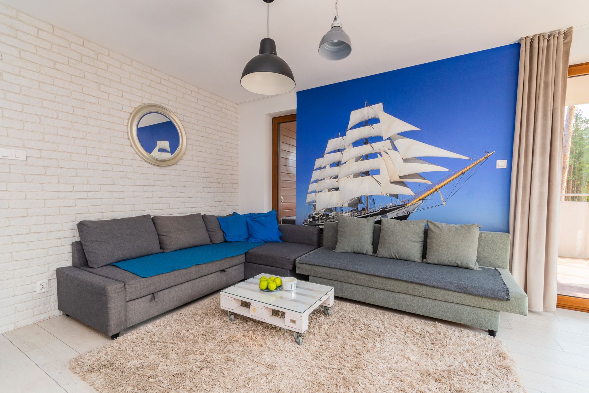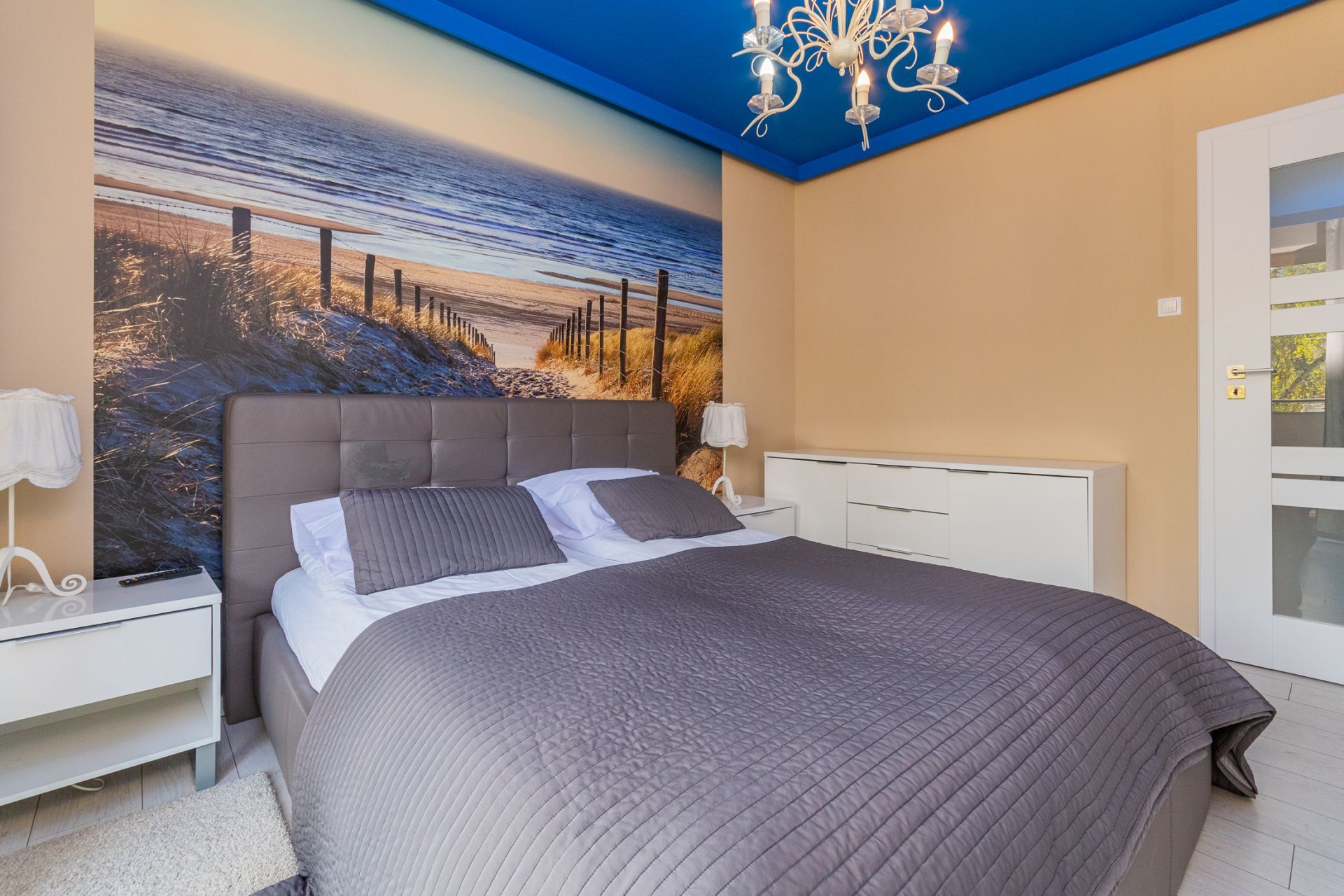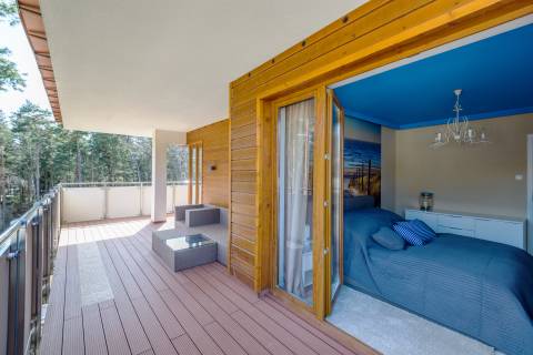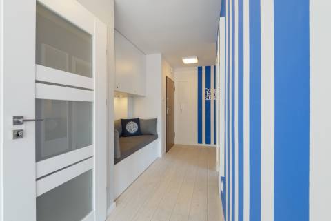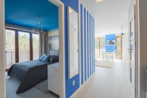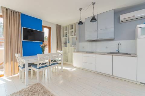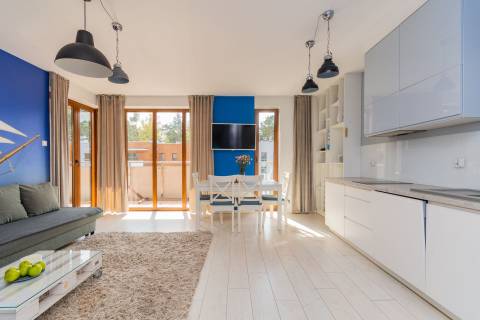 Przestronny apartament o powierzchni 50m2 położony jest na III piętrze, ekspozycja wschodnio-południowa. Składa się z salonu z aneksem kuchennym, niezależnej sypialni, łazienki. Dodatkowo do mieszkania przynależy słoneczny, przestronny balkon o powierzchni 23m2. Do dyspozycji Gości jest siedem miejsc noclegowych: łoże małżeńskie w sypialni oraz rozkładany dwuosobowy narożnik, rozkładana kanapa dwuosobowa w salonie, dodatkowe miejsce noclegowe w przejściu pomiędzy salonem a sypialnią. Przestronne i przytulne wnętrze utrzymane w klimacie nadmorskim spełnia wymogi wszystkich naszych klientów, nawet tych najbardziej wymagających.