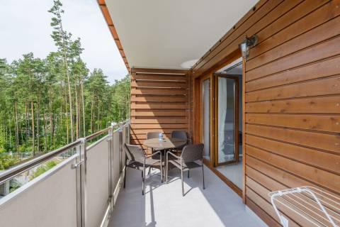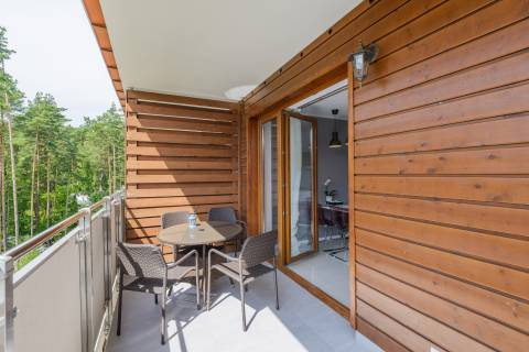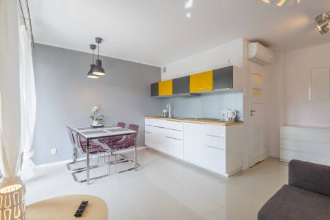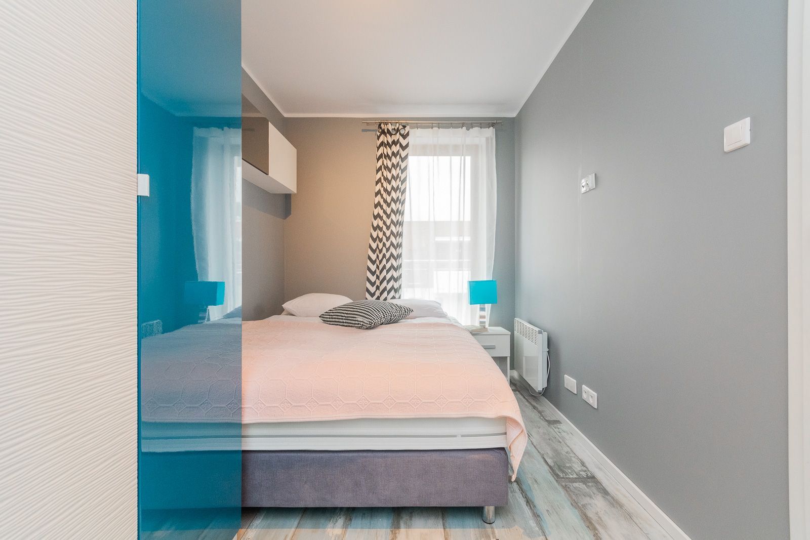 Słoneczny apartament położony jest na III piętrze od strony zachodniej. Powierzchnia mieszkania wynosi 36m2. Wnętrze obejmuje salon i aneks kuchenny, sypialnię, łazienkę oraz obszerny balkon. Pięć miejsc noclegowych to dwuosobowa rozkładana kanapa i łóżko pojedyncze w sypialni oraz kanapa w salonie. Apartament jest doskonale zaaranżowany. Posiada duże okna, które nadają pomieszczeniom przestronny charakter, jak również wiele dodatków i rozwiązań sprawiających, że mieszkanie prezentuje się przytulnie i komfortowo.