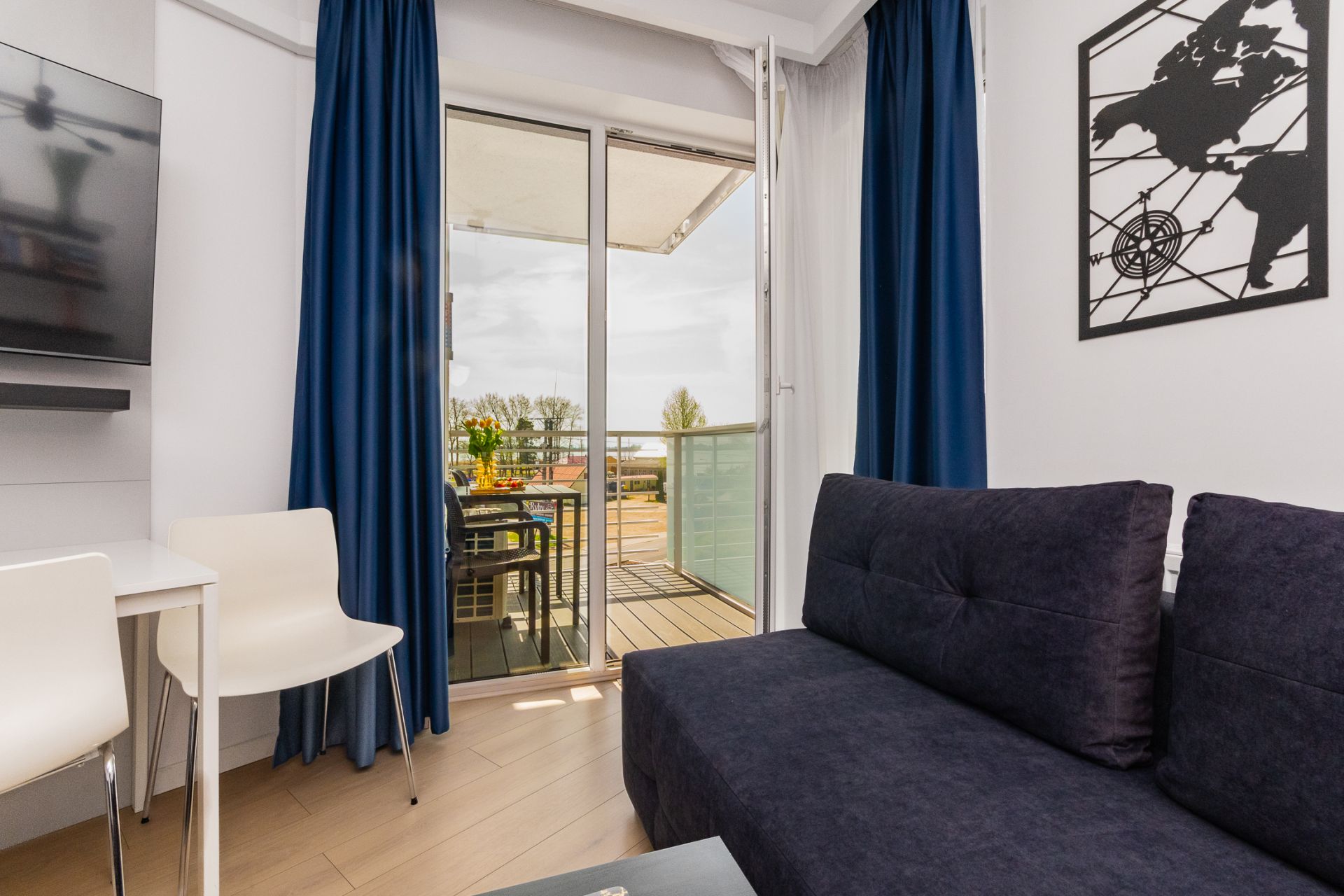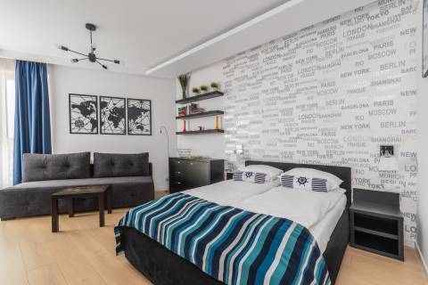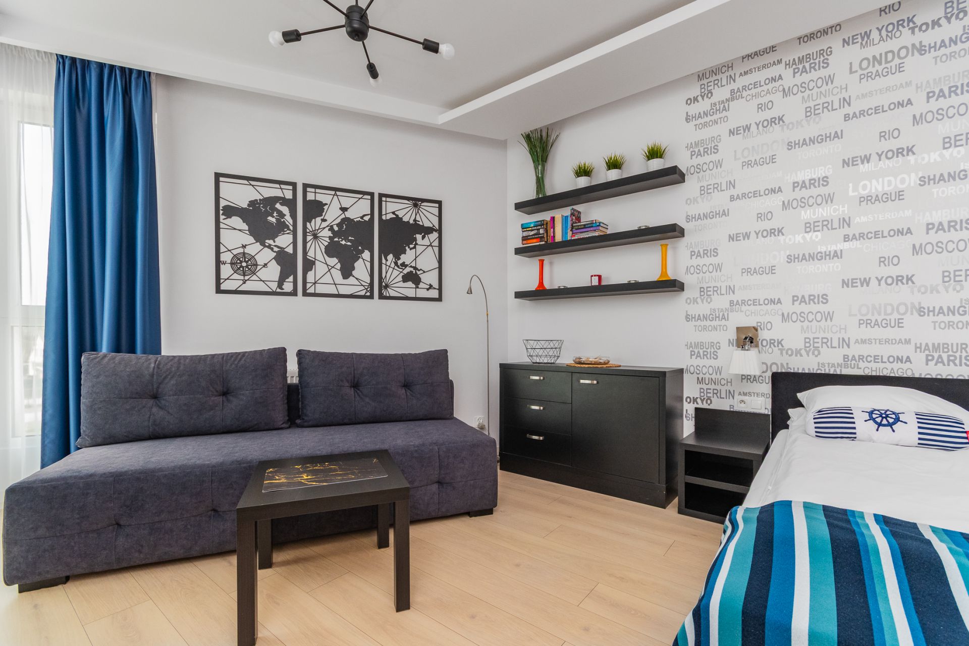 Apartament o powierzchni 26m2 wyposażony jest w niezbędne rzeczy potrzebne do spokojnego odpoczynku. Składa się z salonu połączonego z w pełni wyposażonym aneksem kuchennym, łazienki oraz balkonu od strony zachodniej. Apartament przeznaczony jest dla trzech osób. Miejsca noclegowe to łoże małżeńskie oraz rozkładana jednoosobowa kanapa. Starannie dobrane dodatki nadają mieszkaniu przytulnego klimatu.