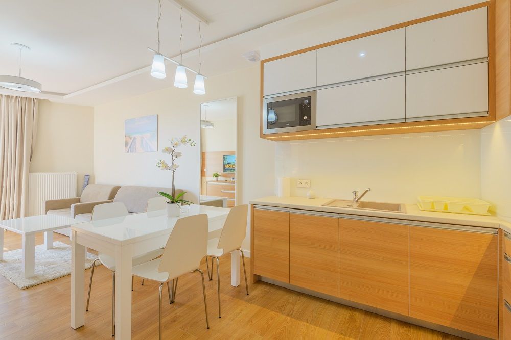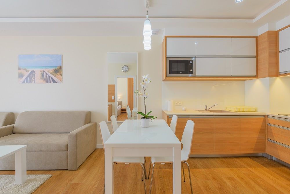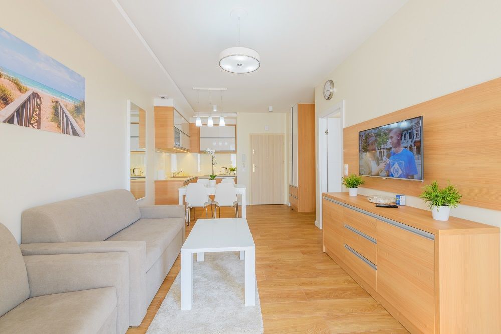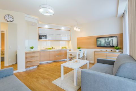 Komfortowe apartamenty utrzymane w jasnych barwach o powierzchni 33m2. Na przestronne i komfortowo zaaranżowane wnętrze składają się: salon z w pełni wyposażonym aneksem kuchennym, sypialnia, łazienka oraz balkon. Do dyspozycji gości jest pięć miejsc noclegowych: łoże małżeńskie w sypialni oraz dwie rozkładane kanapy w salonie - jednoosobowa i dwuosobowa. Dominują jasne, ciepłe barwy, które wprowadzają przytulny klimat. Dodatkowo do apartamentu przynależy 1 miejsce parkingowe. Apartamenty z tego standardu znajdują się na parterze bądź na I piętrze – nie ma możliwości wyboru piętra ani strony świata.