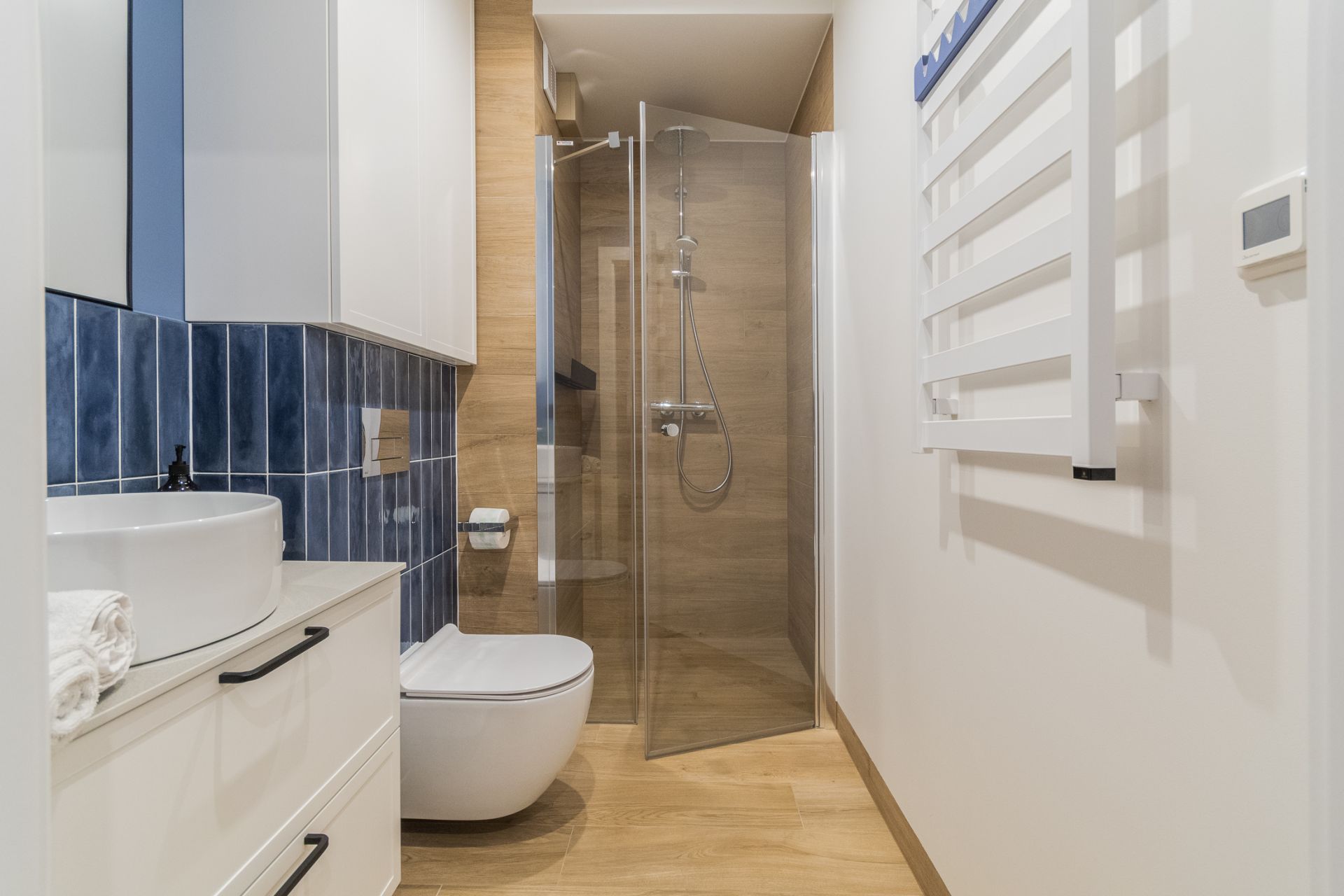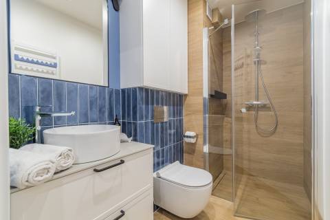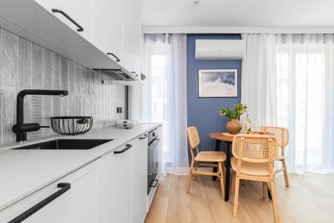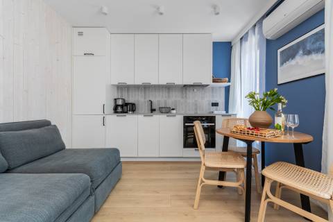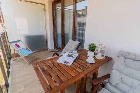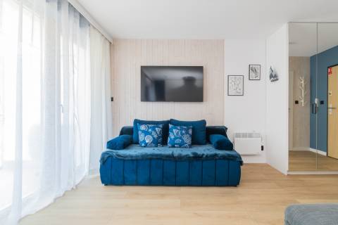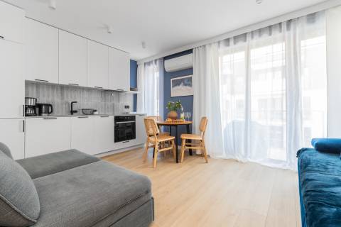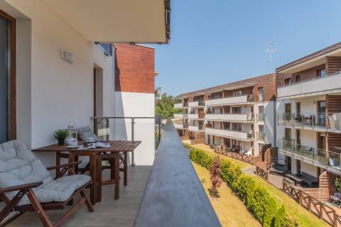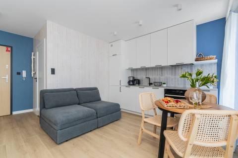 Salon zintegrowany z aneksem kuchennym oraz strefą sypialnianą, w której znajdują się dwie rozkładane, podwójne sofy. Aneks kuchenny wyposażony w niezbędny sprzęt AGD (lodówka, czajnik, płyta grzewcza, piekarnik, pralka, zmywarka oraz ekspres do kawy). W łazience kabina prysznicowa, umywalka, suszarka do włosów. Na balkonie do dyspozycji gości zestaw wypoczynkowy.