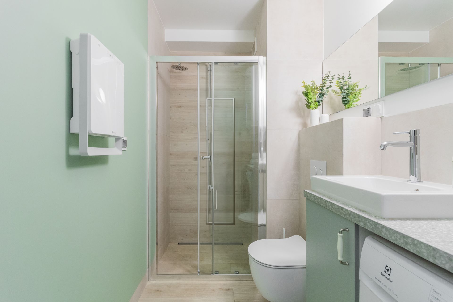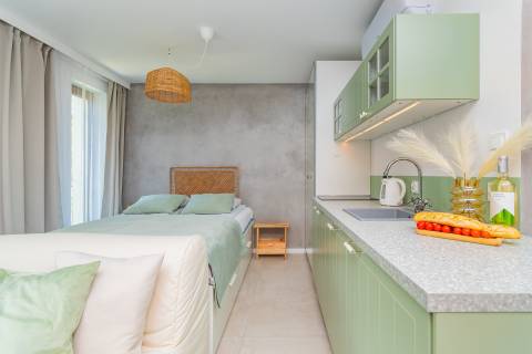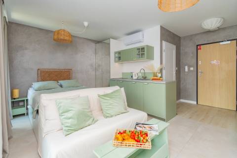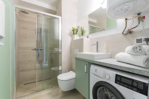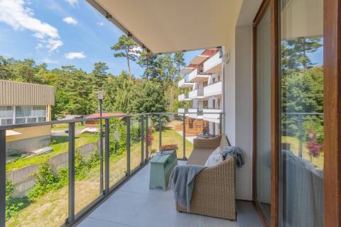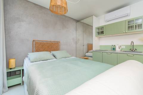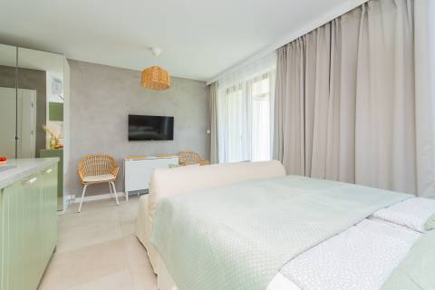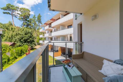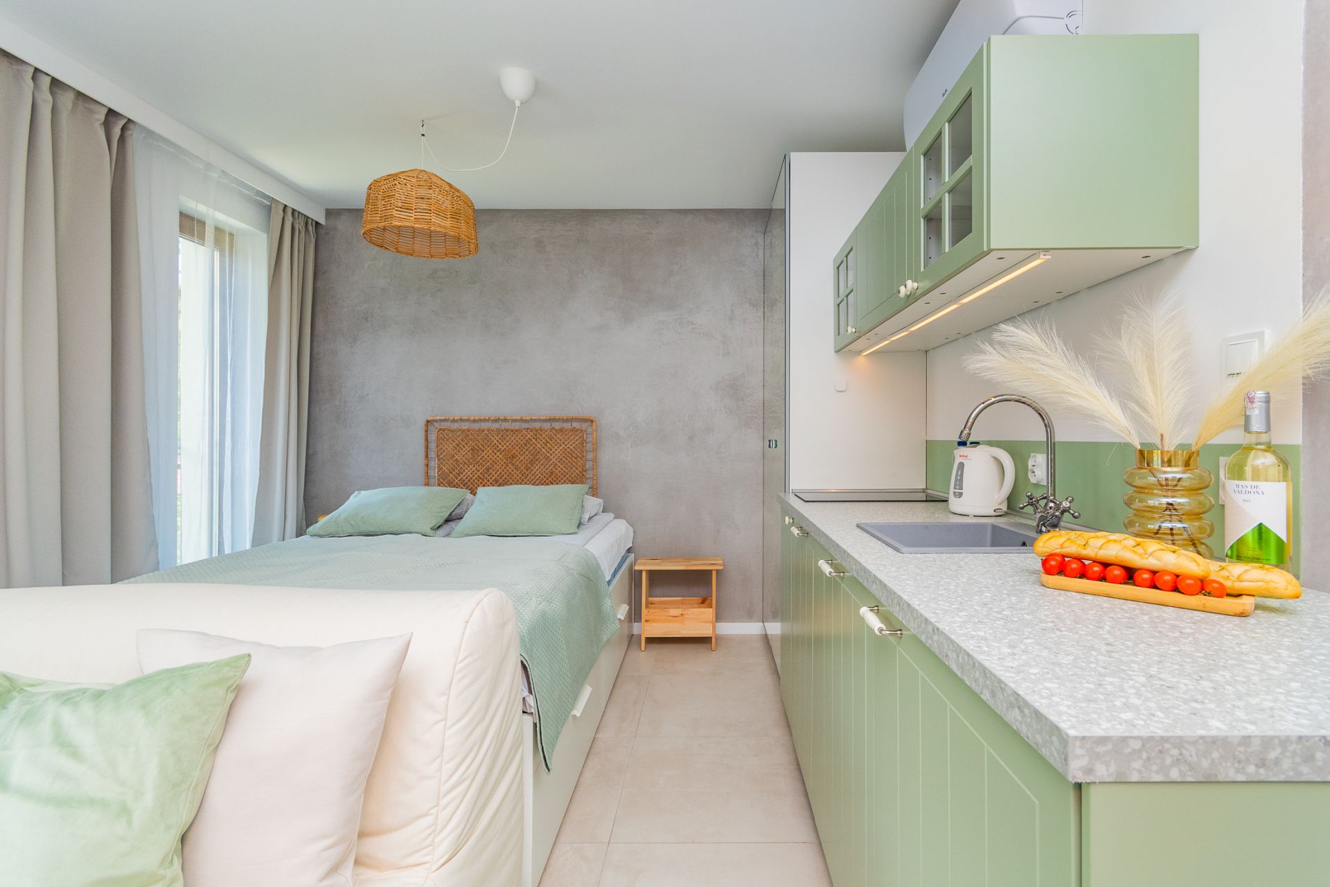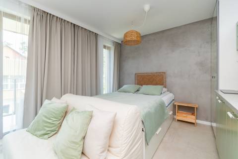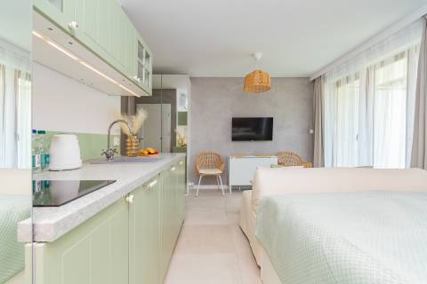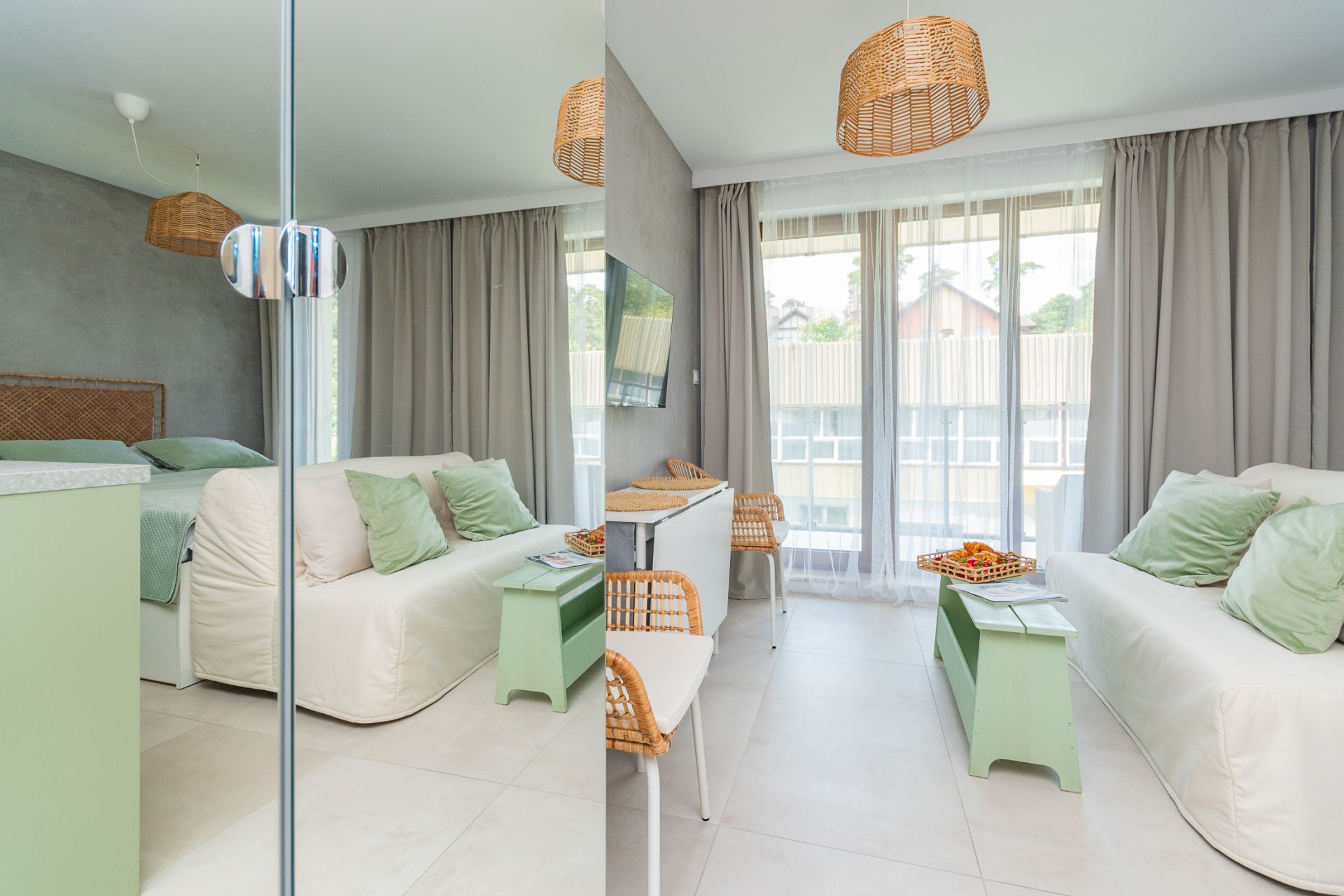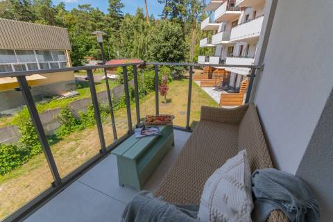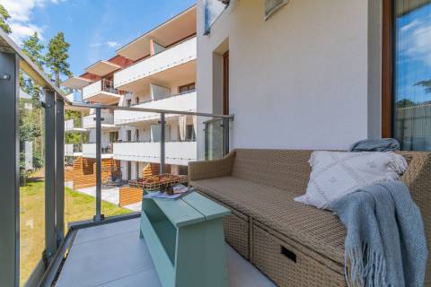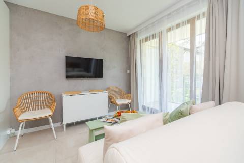 Stylowy apartament o powierzchni 24m2 położony jest na I piętrze od strony zachodniej. Składa się z salonu połączonego z aneksem kuchennym, łazienki oraz słonecznego balkonu. Miejsca do spania to łoże małżeńskie oraz mała, jednoosobowa rozkładana kanapa. Idealnie sprawdzi się dla 2 osób dorosłych bądź rodziny 2+1. Aneks kuchenny wyposażony jest w płytę kuchenną, mikrofalówkę, zmywarkę. Na wyposażeniu jest pralka, dzięki czemu apartament jest odpowiedni na dłuższe pobyty. Do apartamentu przynależy miejsce parkingowe nr 2 w hali garażowej G-2.