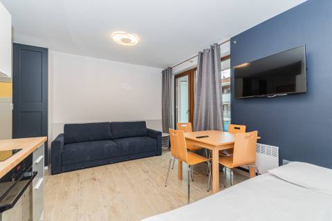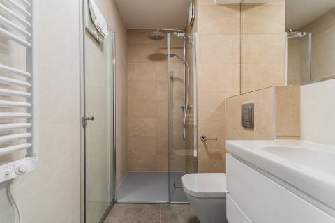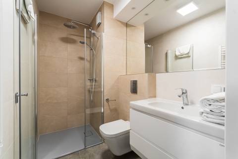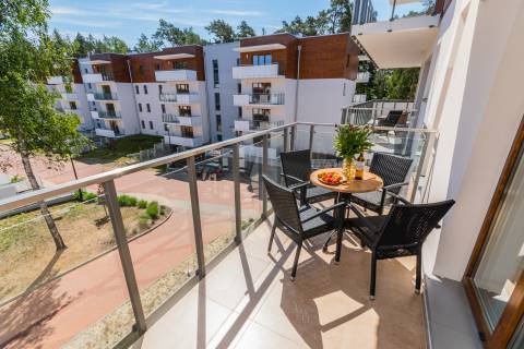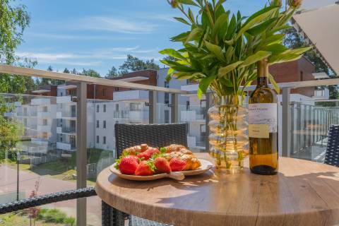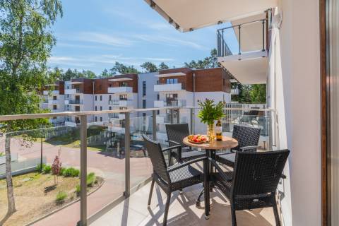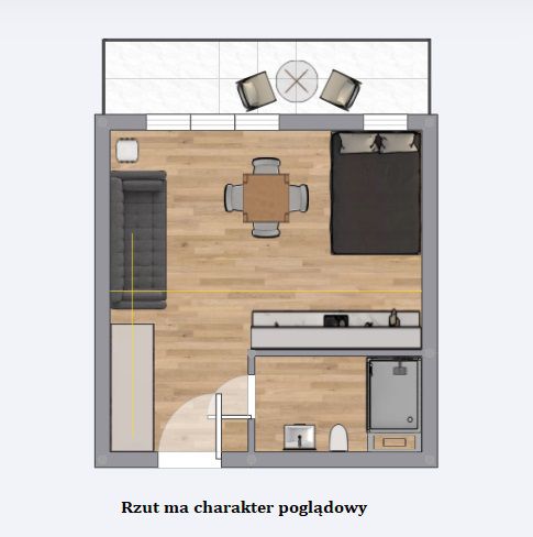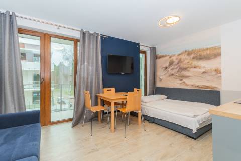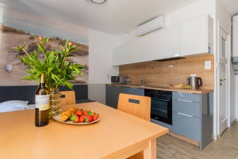 Funkcjonalnie zaprojektowany apartament o powierzchni 24 m2. Do wykończenia zastosowane renomowane hiszpańskie płytki ceramiczne. Zabudowa kuchenna wyposażona w czajnik, płytę grzewczą, lodówkę oraz piekarnik.
