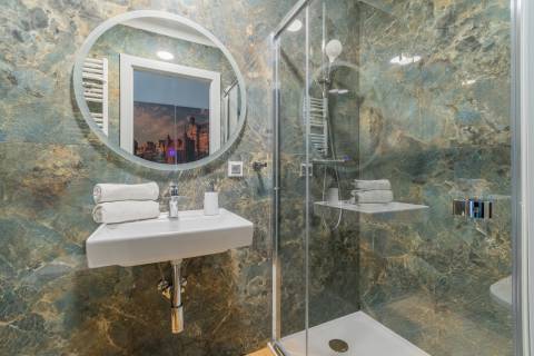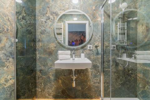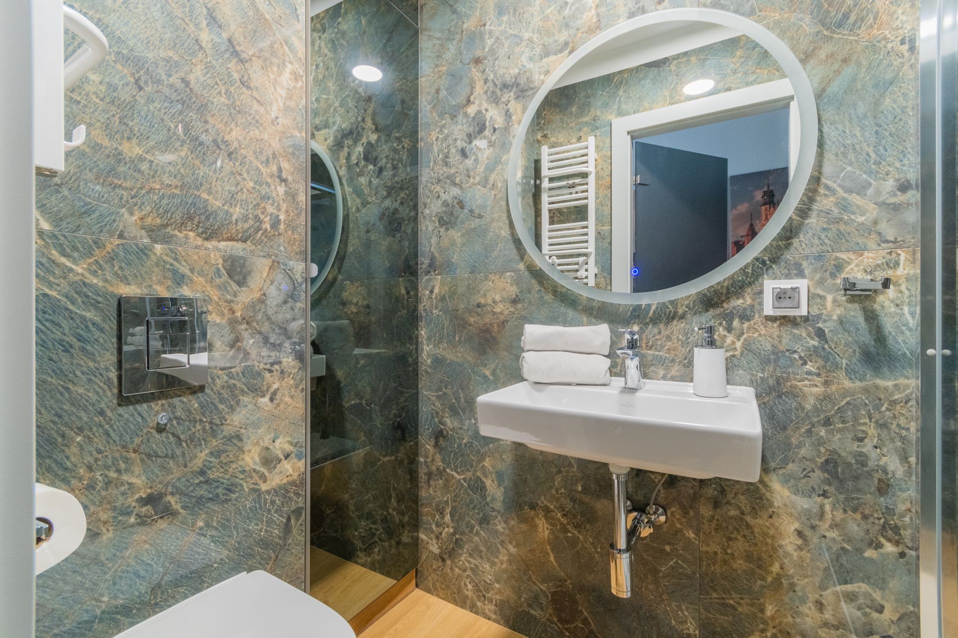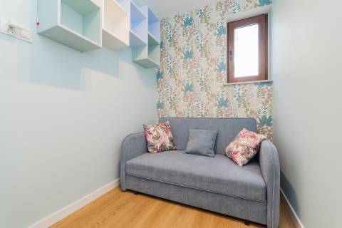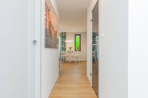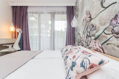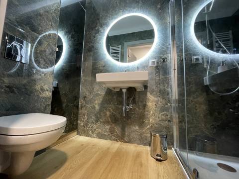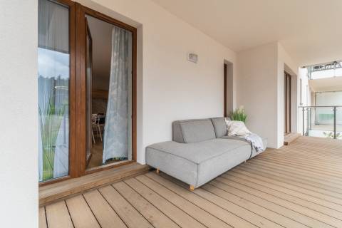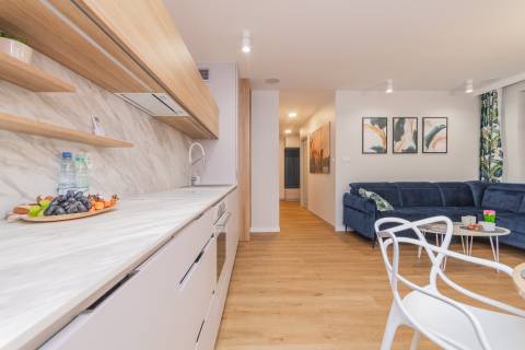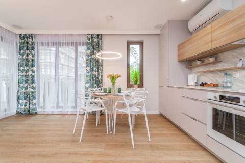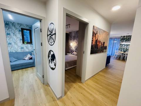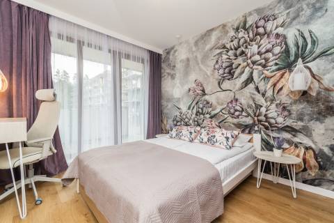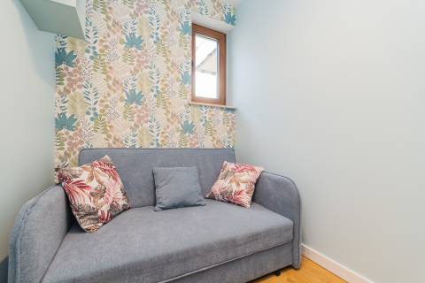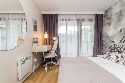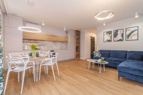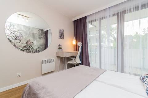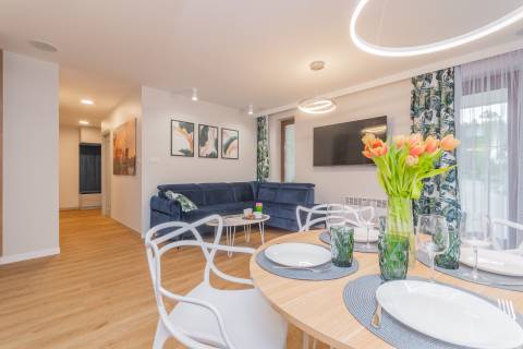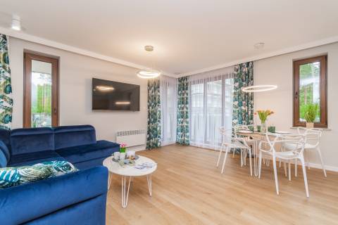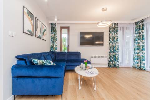 Duży apartament o powierzchni 50m2 położony jest na parterze. Ekspozycja wschodnio-południowa. Na funkcjonalne wnętrze składa się salon zintegrowany z aneksem kuchennym, dwie zamykane sypialnie, łazienka oraz balkon. Mieszkanie przystosowane jest dla maksymalnie sześcioosobowej grupy (optymalnie dla 5 osób). W jednej sypialni znajduje się łoże małżeńskie, w rozkładana amerykanka o wymiarze 120cmx190 cm. Na dużym balkonie komfortowy zestaw wypoczynkowy.