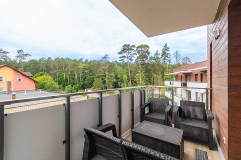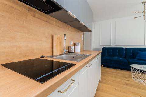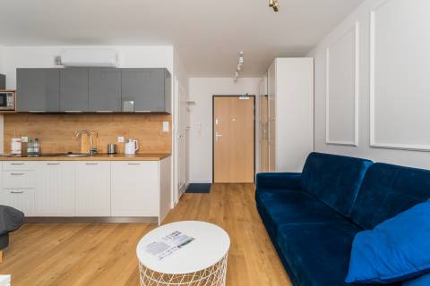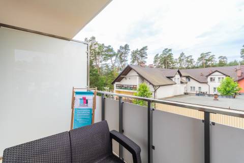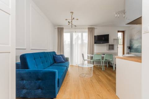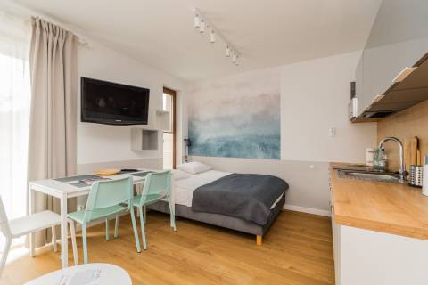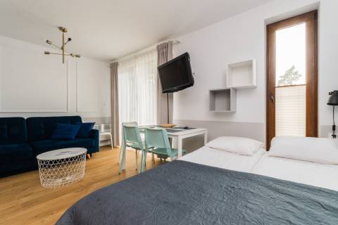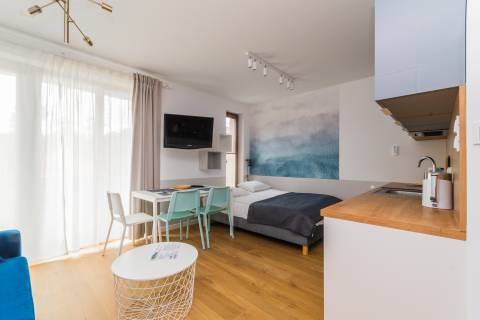 Funkcjonalnie zaprojektowany apartament o powierzchni 24 m2, wg najnowszej koncepcji aranżacyjnej .Zabudowa kuchenna wyposażona w zmywarkę, pralkę, płytę indukcyjną, czajnik, mikrofalówkę, lodówkę. W apartamencie przygotowano miejsca noclegowe dla dwóch osób. W łazience kabina prysznicowa, umywalka. Na wyposażeniu suszarka do włosów. Lokal położony jest na III piętrze od strony zachodniej . Na słonecznym balkonie do dyspozycji gości zestaw mebli wypoczynkowych.