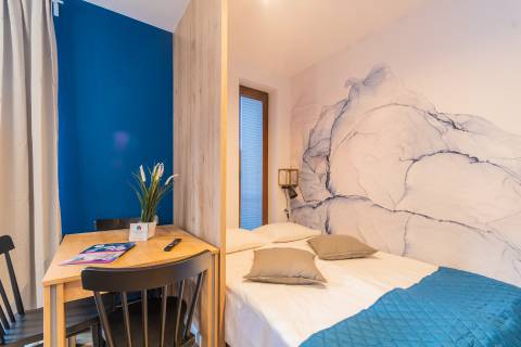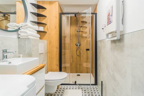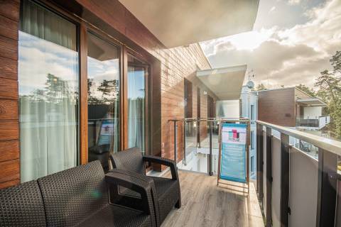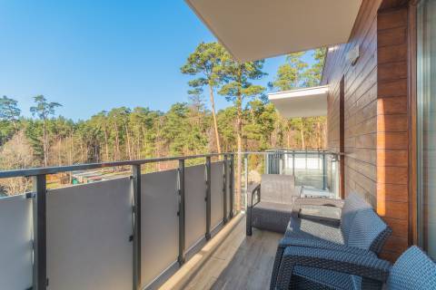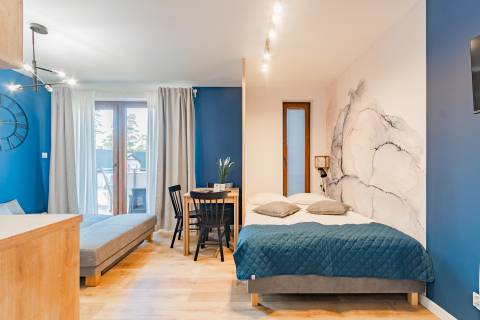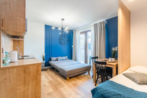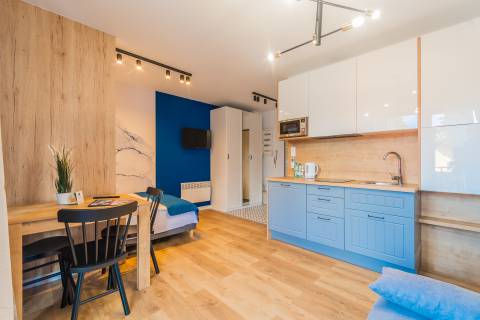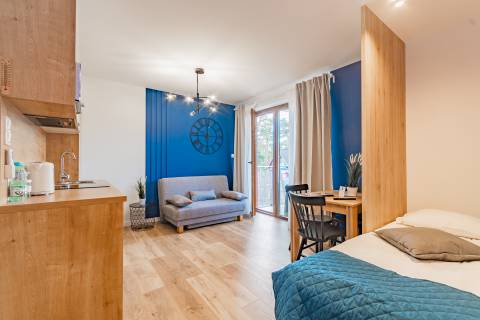 Apartament o powierzchni 24 m2. Zabudowa kuchenna wyposażona w zmywarkę, płytę grzewczą, czajnik, mikrofalówkę, pralkę oraz lodówkę. Do dyspozycji w strefie mieszkalnej: sofa dwuosobowa oraz łóżko kontynentalne. W łazience kabina prysznicowa, umywalka. Do Państwa dyspozycji sprzęty codziennego użytku tj. suszarka do włosów, odkurzacz czy żelazko. Na balkonie zestaw wypoczynkowy.