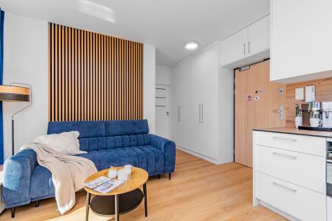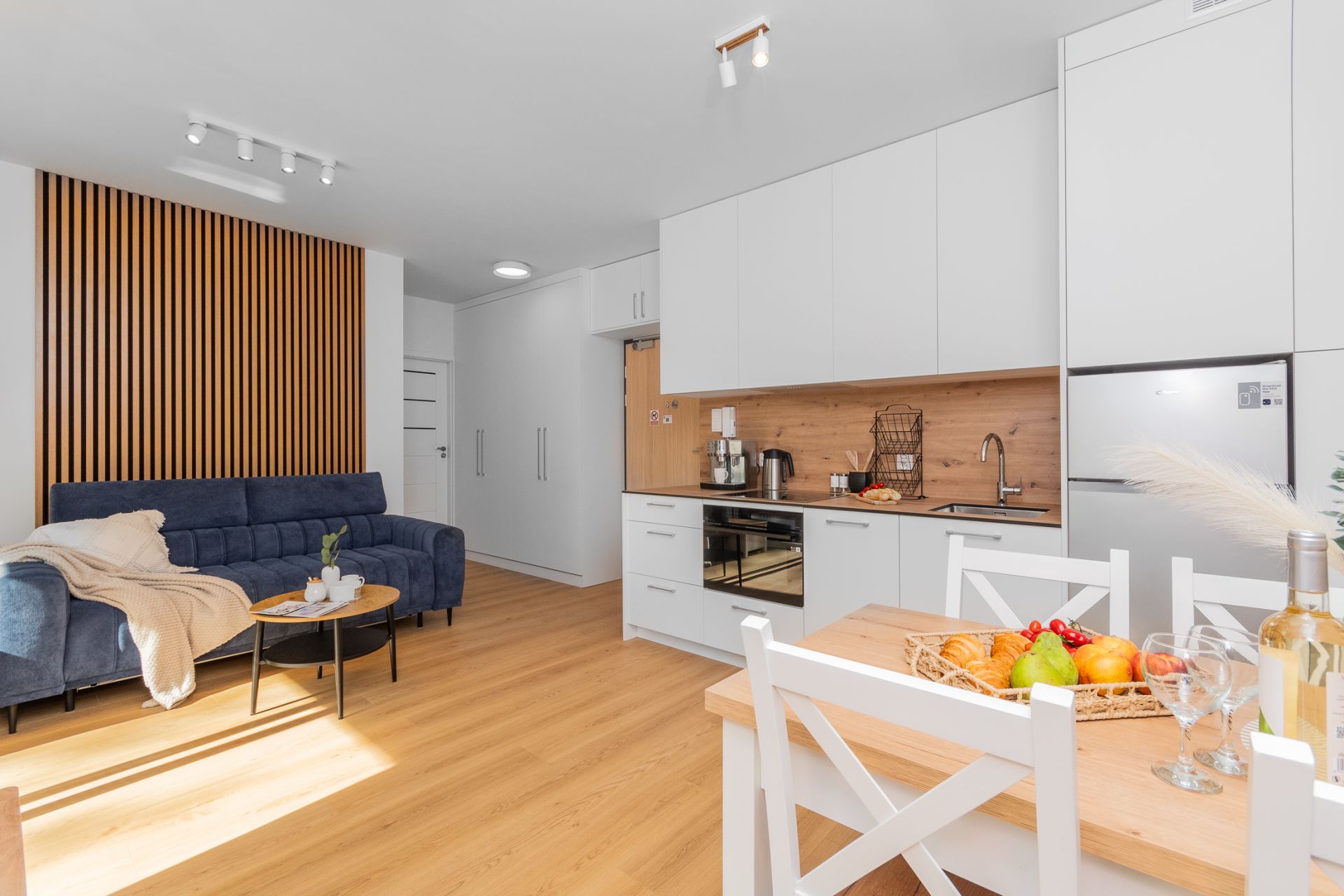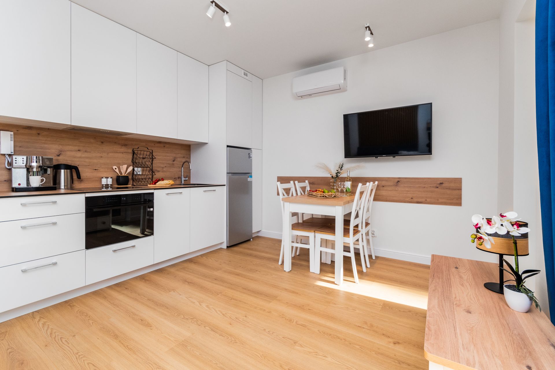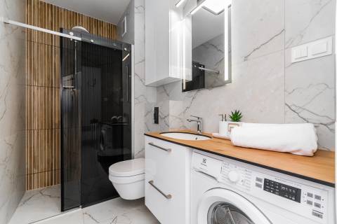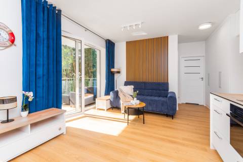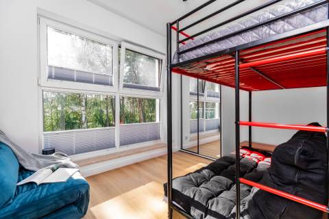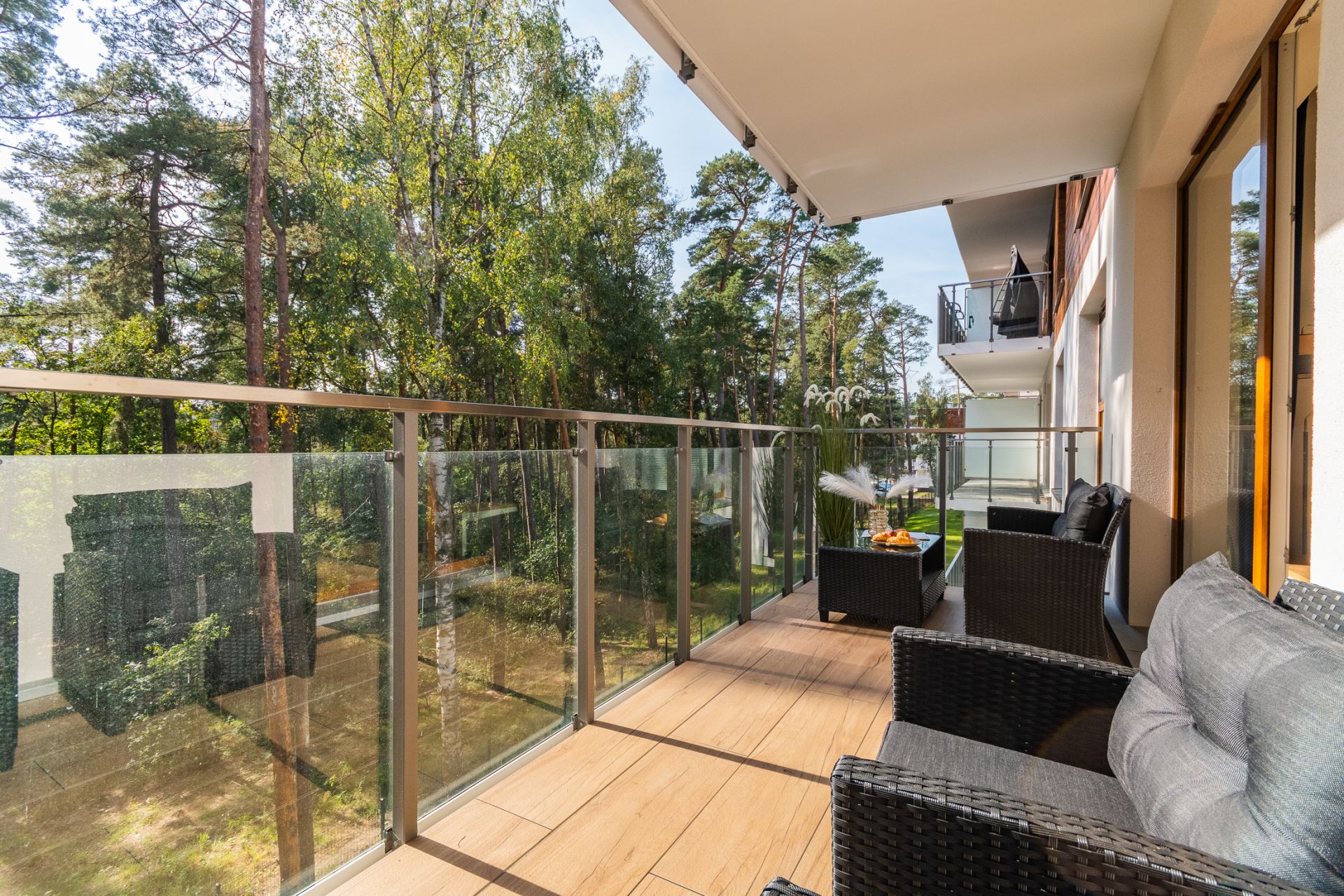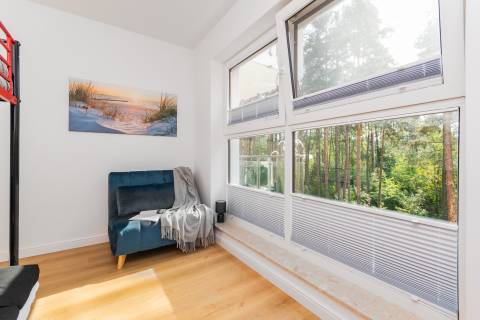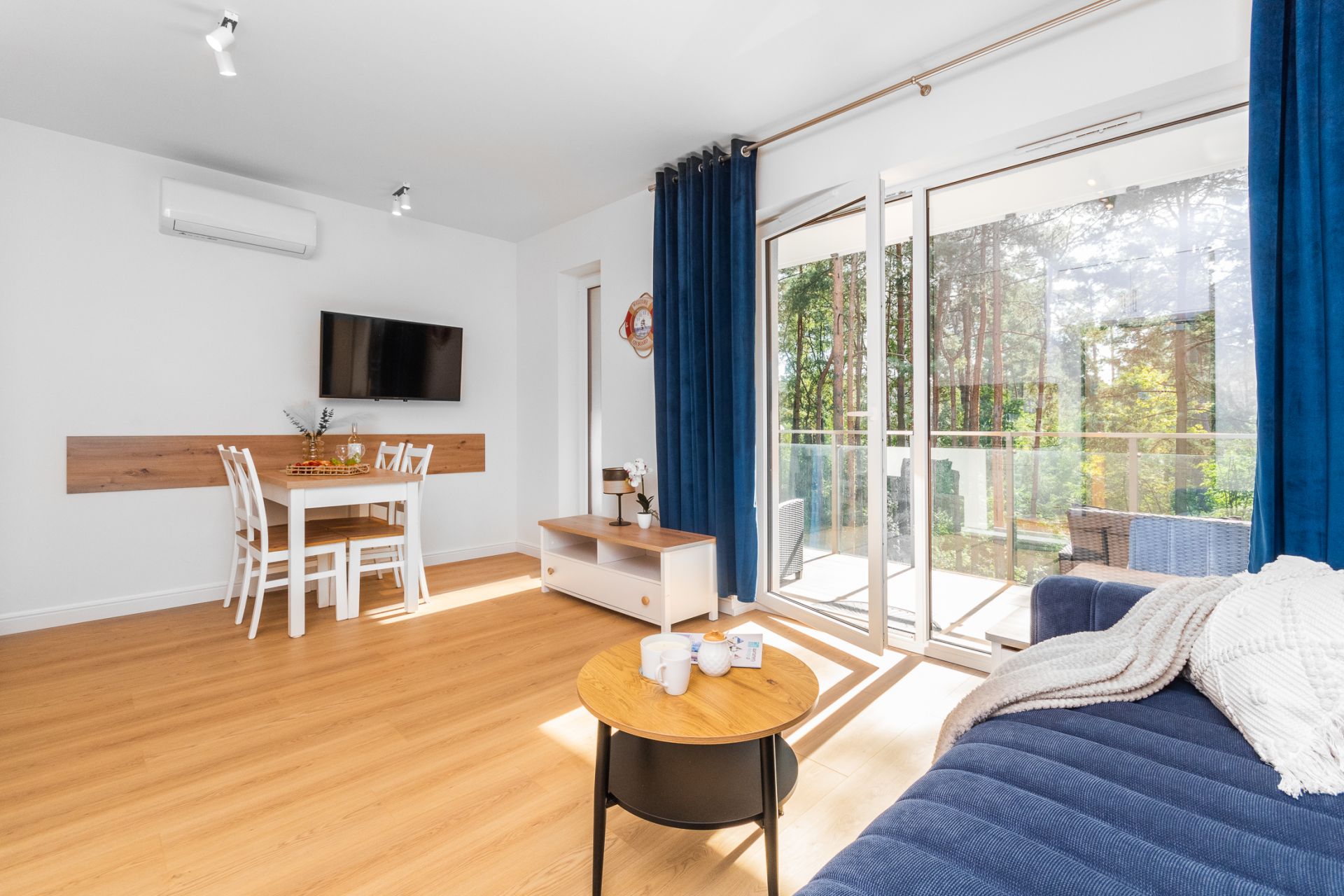 Ogromnym atutem apartamentu jest balkon z kojącym widokiem na las – wystarczy otworzyć drzwi, by poczuć bliskość natury i pozwolić sobie na prawdziwy relaks. Okolica sprzyja zarówno wypoczynkowi, jak i aktywnościom na świeżym powietrzu.