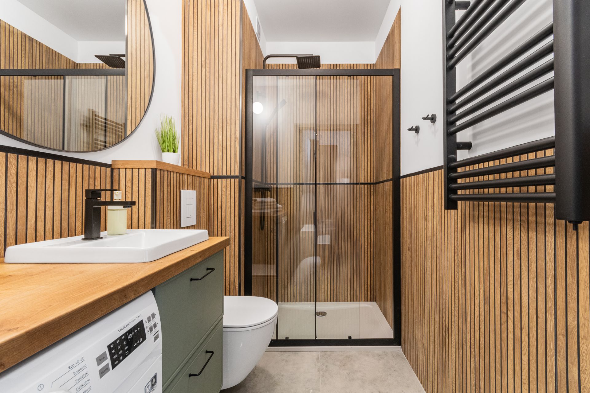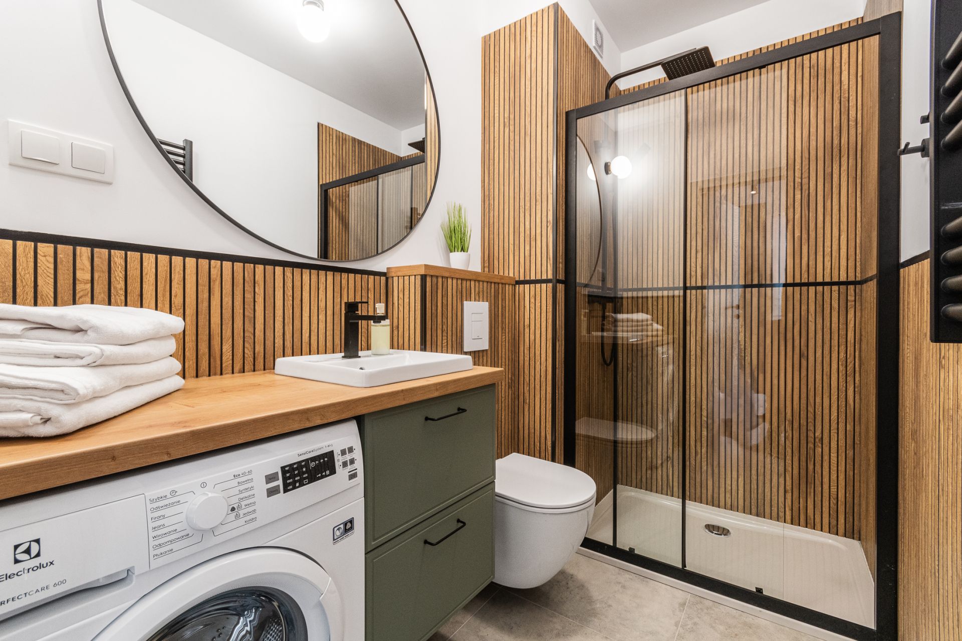 - Nowoczesna łazienka z prysznicem i funkcjonalnym wyposażeniem.