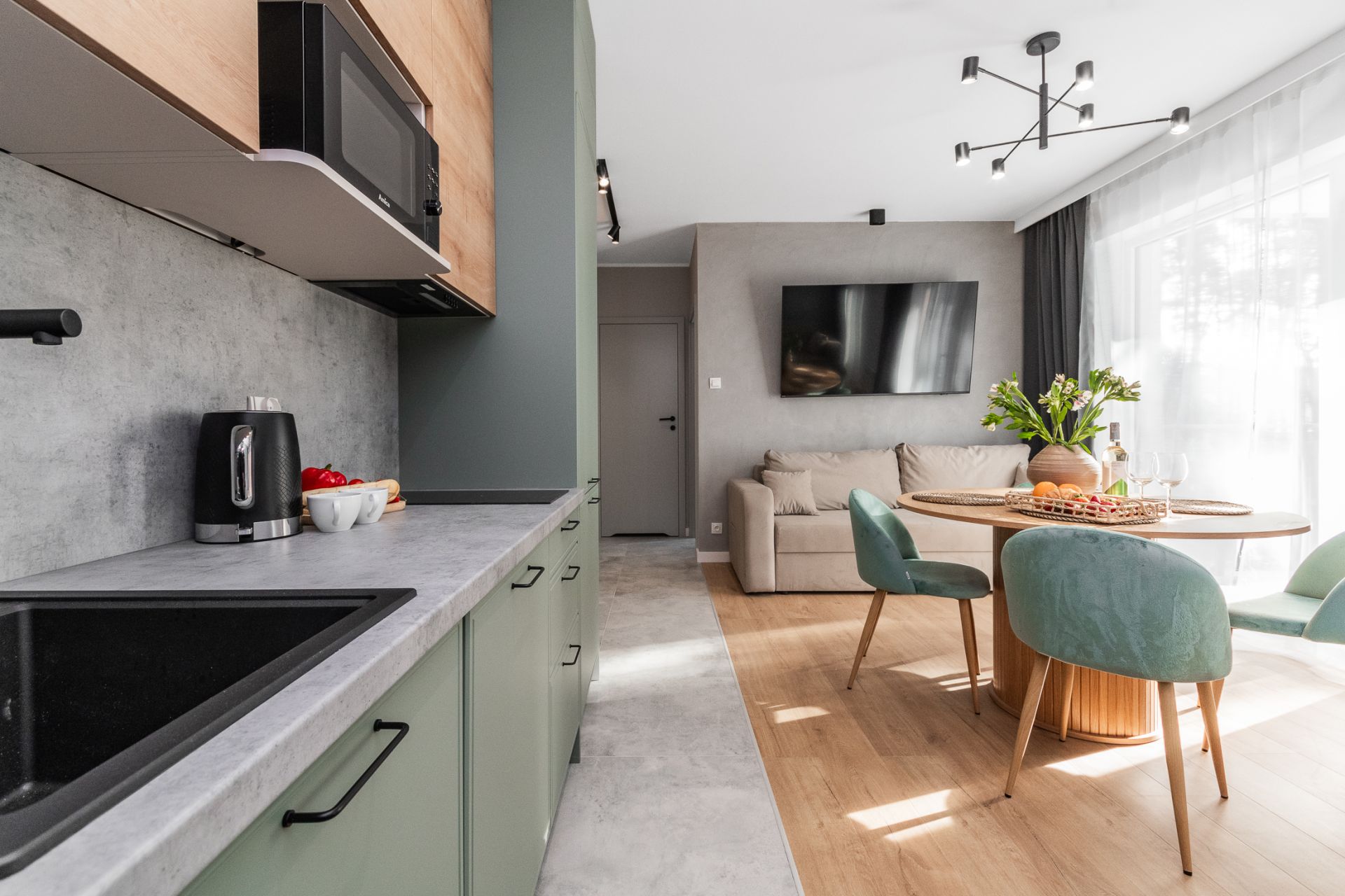 - Przestronny salon z otwartym aneksem kuchennym, tworzący wygodną strefę dzienną do wspólnego spędzania czasu.