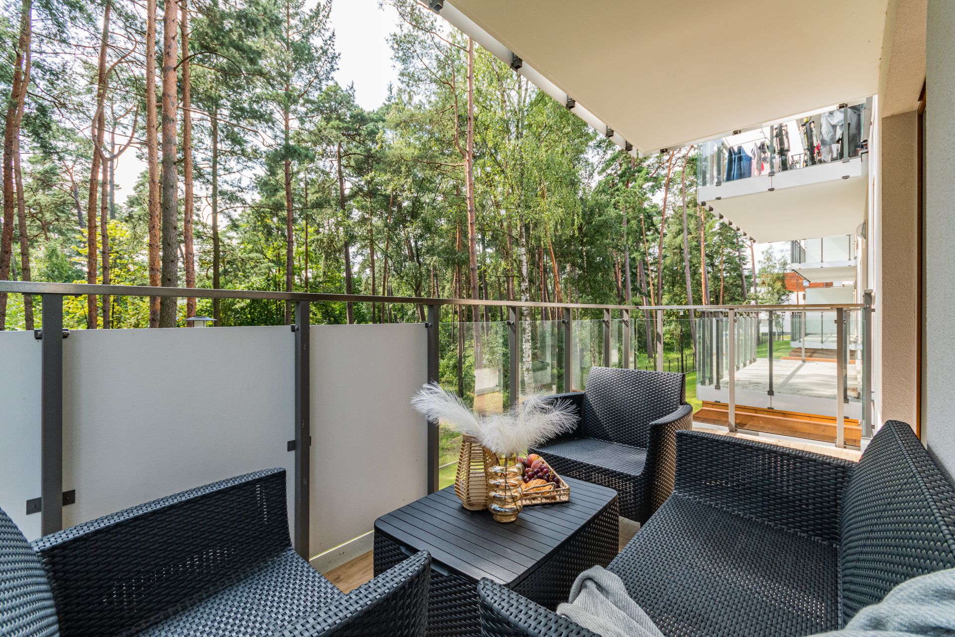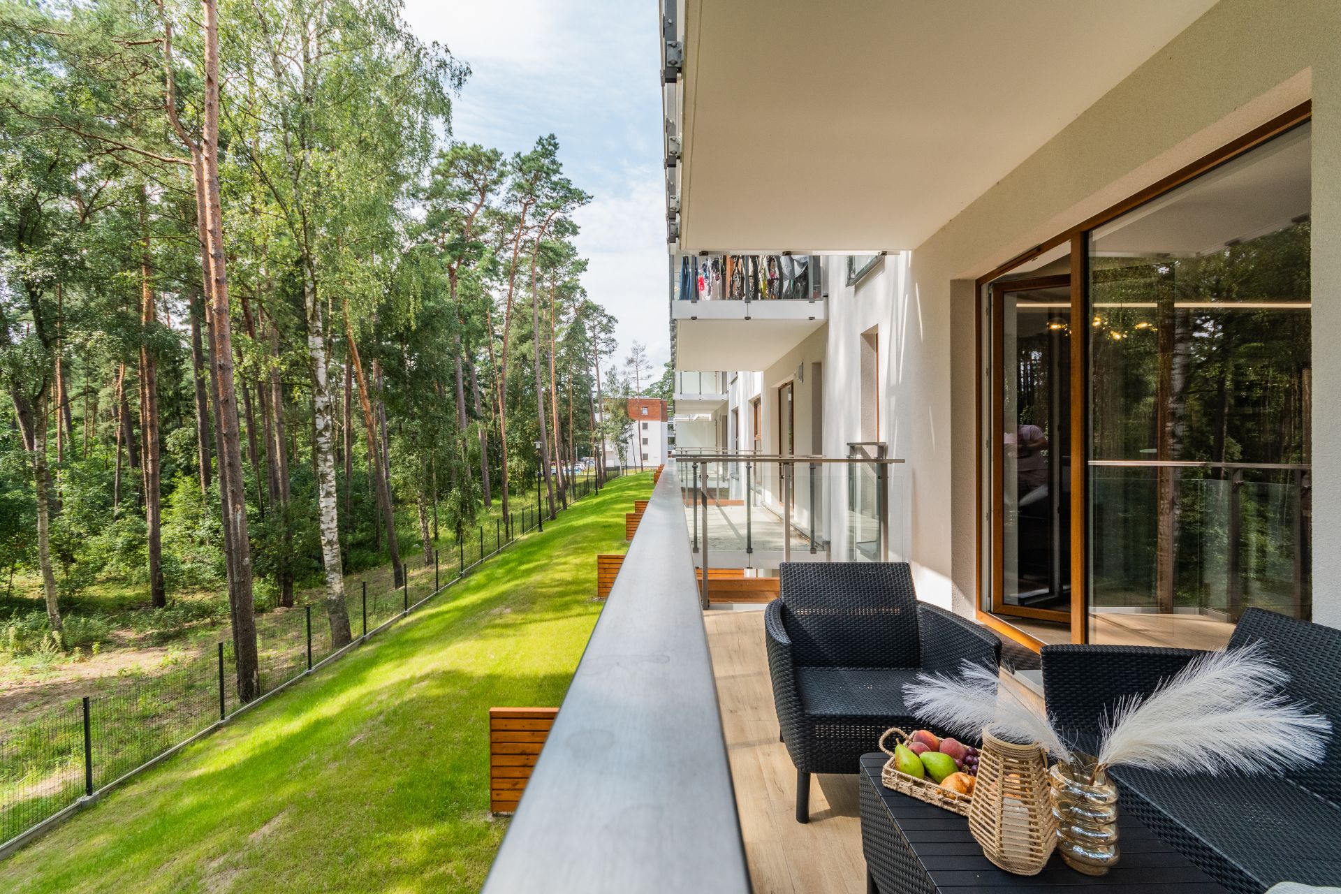 - Duży balkon z ekspozycją na trzy strony świata, z widokiem na las – idealne miejsce na poranną kawę lub wieczorny relaks