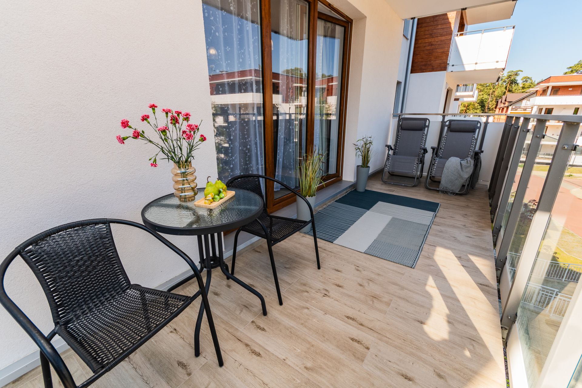 Na gości czeka zestaw wypoczynkowy i dwa leżaki – idealne miejsce na poranną kawę lub wieczorny relaks na świeżym powietrzu.