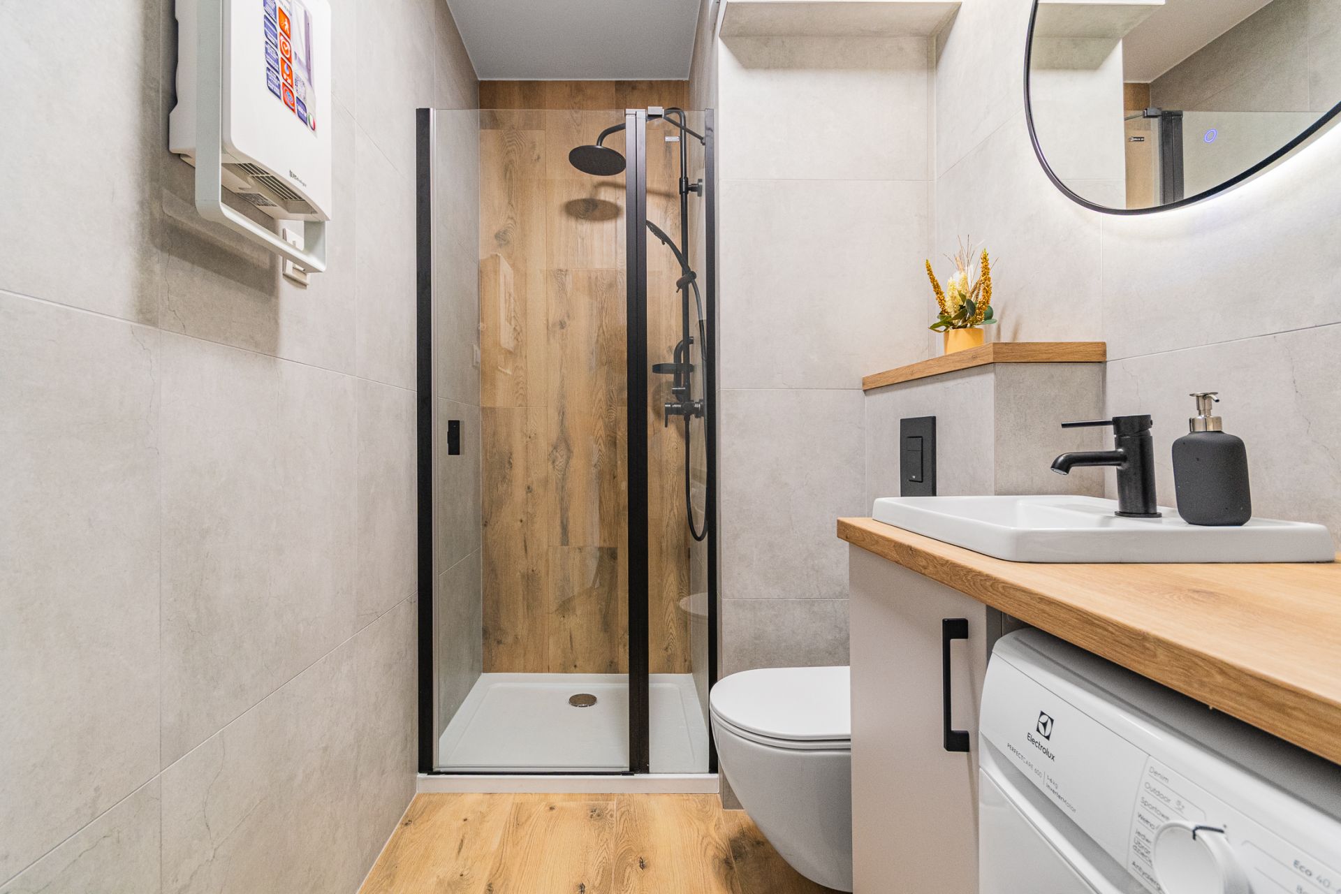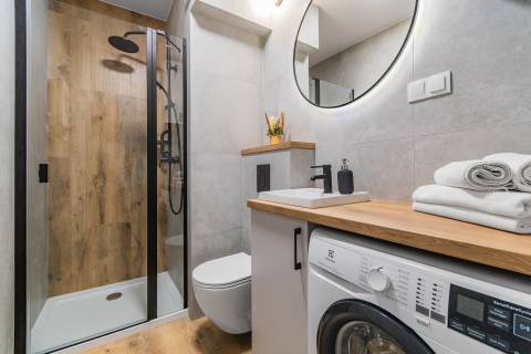 - Stylowa łazienka z dużym prysznicem typu walk-in, pralką, toaletą i umywalką,