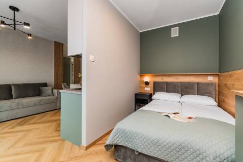 - Łoże małżeńskie + rozkładana sofa – wygodny nocleg dla maks. 4 osób,