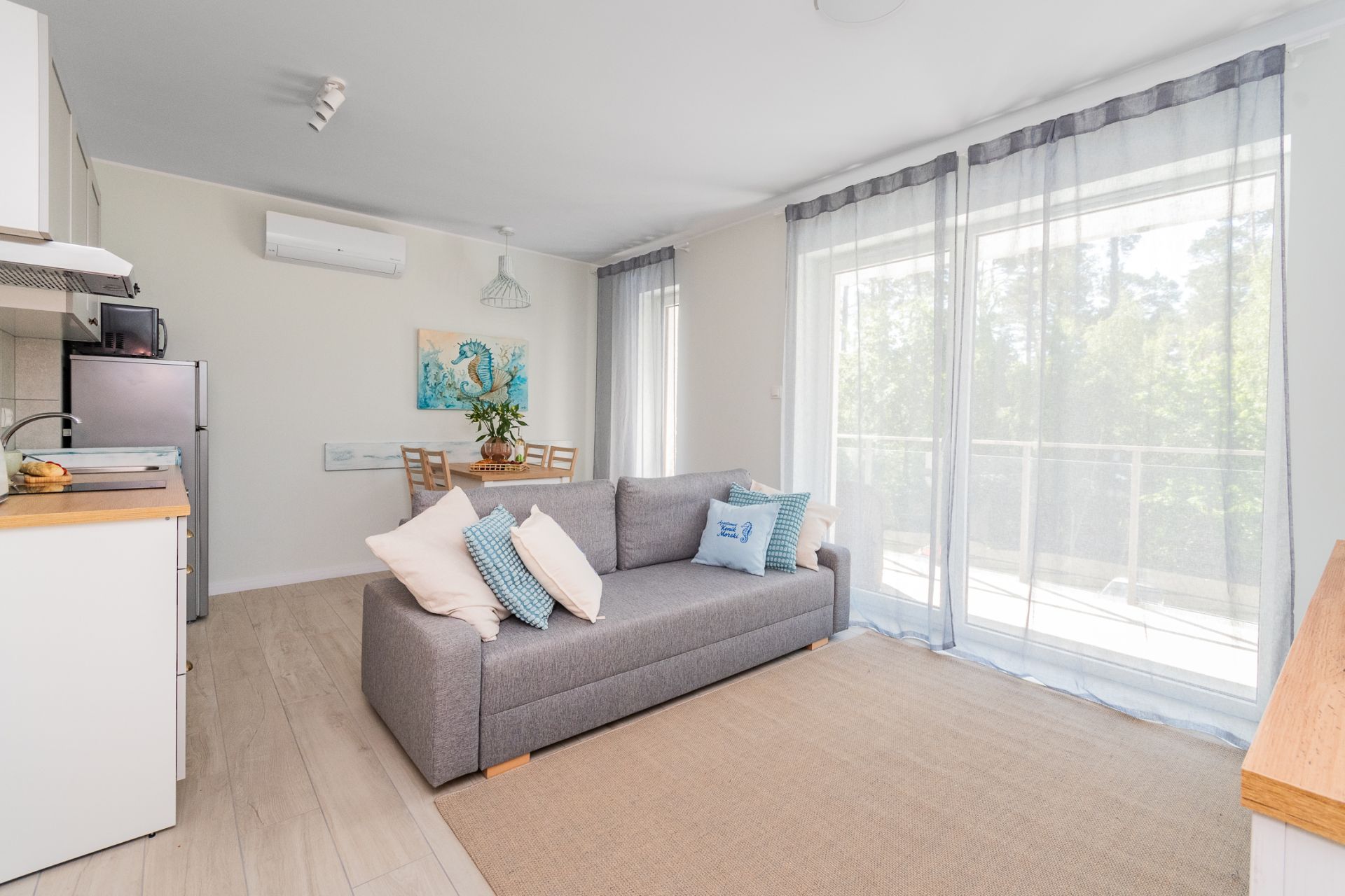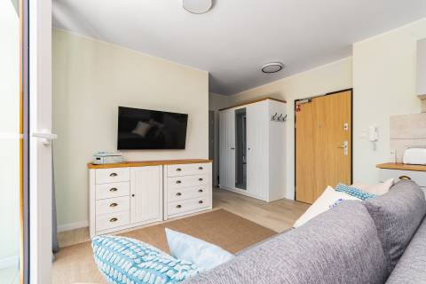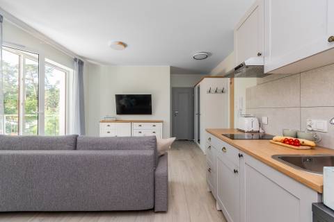 - Przestronny salon z rozkładaną kanapą oraz aneksem kuchennym